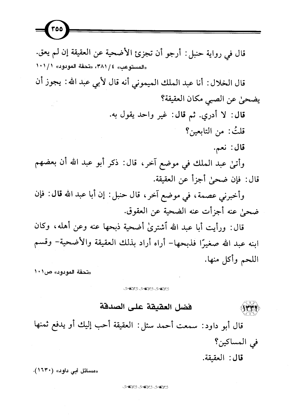 قال أبو داود: سمعت أحمد سئل: العقيقة أحب إليك أو يدفع ثمنها في المساكين؟