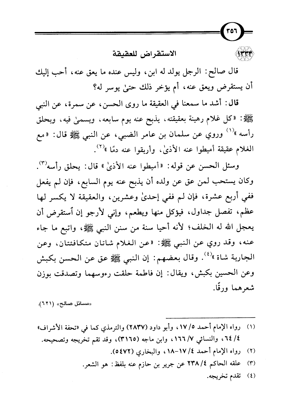 قال: أشد ما سمعنا في العقيقة ما روى الحسن، عن سمرة، عن النبي -صلى اللَّه عليه وسلم-: "كل غلام رهينة بعقيقته، يذبح عنه يوم سابعه، ويسمى فيه، ويحلق رأسه" (¬1) وروي عن سلمان بن عامر الضبي، عن النبي -صلى اللَّه عليه وسلم- قال: "مع الغلام عقيقة أميطوا عنه الأذى، وأريقوا عنه دمًا" (¬2).