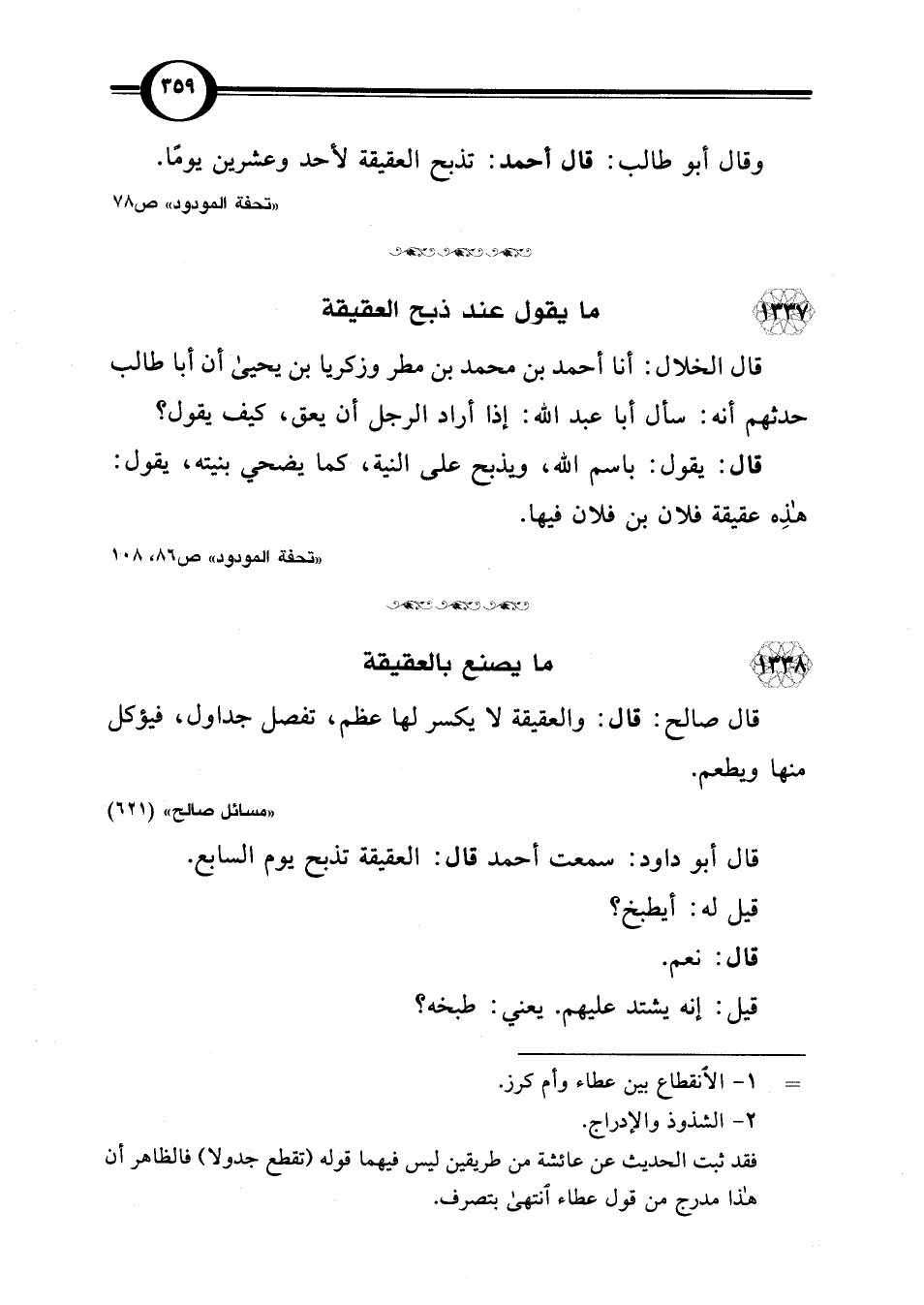 قال صالح: قال: والعقيقة لا يكسر لها عظم، تفصل جداول، فيؤكل منها ويطعم.
