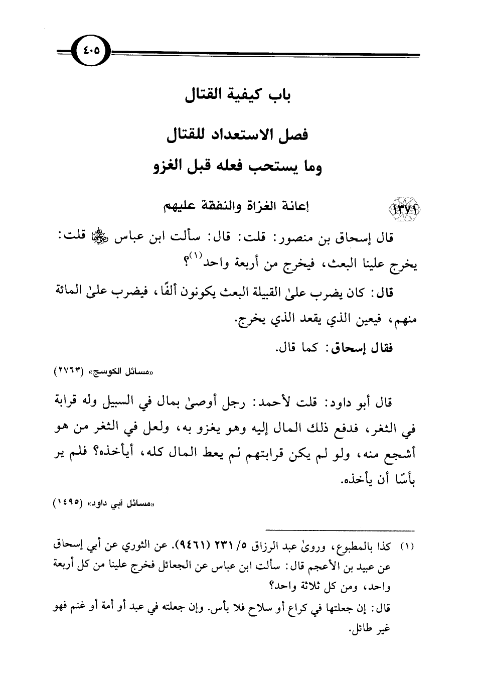 قال إسحاق بن منصور: قلت: قال: سألت ابن عباس -رضي اللَّه عنهما- قلت: يخرج علينا البعث، فيخرج من أربعة واحد (¬1)؟