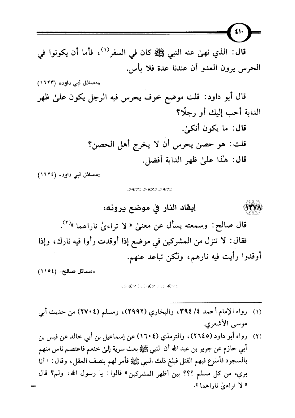 (¬2) رواه أبو داود (2645)، والترمذي (1604) عن إسماعيل بن أبي خالد عن قيس بن أبي حازم عن جرير بن عبد اللَّه أن النبي -صلى اللَّه عليه وسلم- بعث سرية إلى خثعم فاعتصم ناس منهم بالسجود فأسرع فيهم القتل فبلغ ذلك النبي -صلى اللَّه عليه وسلم- فأمر لهم بنصف العقل، وقال: "أنا بريء من كل مسلم؟ ؟ ؛ بين أظهر المشركين" قالوا: يا رسول اللَّه، ولم؟ قال "لا تراءى ناراهما". =