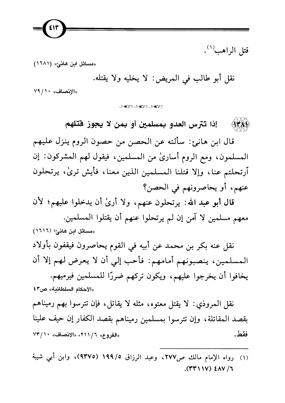قال ابن هانئ: سألته عن الحصن من حصون الروم ينزل عليهم المسلمون، ومع الروم أسارى من المسلمين، فيقول لهم المشركون: إن ارتحلتم عنا، وإلا قتلنا المسلمين الذين معنا، فأيش ترى، يرتحلون عنهم، أو يحاصرونهم في الحصن؟