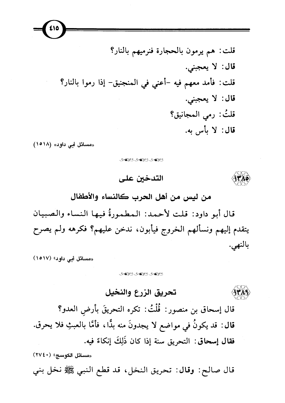 قال إسحاق بن منصور: قُلْتُ: تكره التحريقَ بأرضِ العدو؟