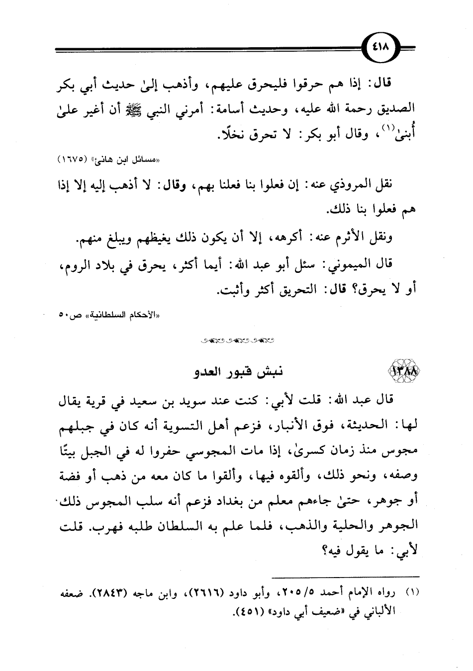 قال الميموني: سئل أبو عبد اللَّه: أيما أكثر، يحرق في بلاد الروم، أو لا يحرق؟ قال: التحريق أكثر وأثبت.