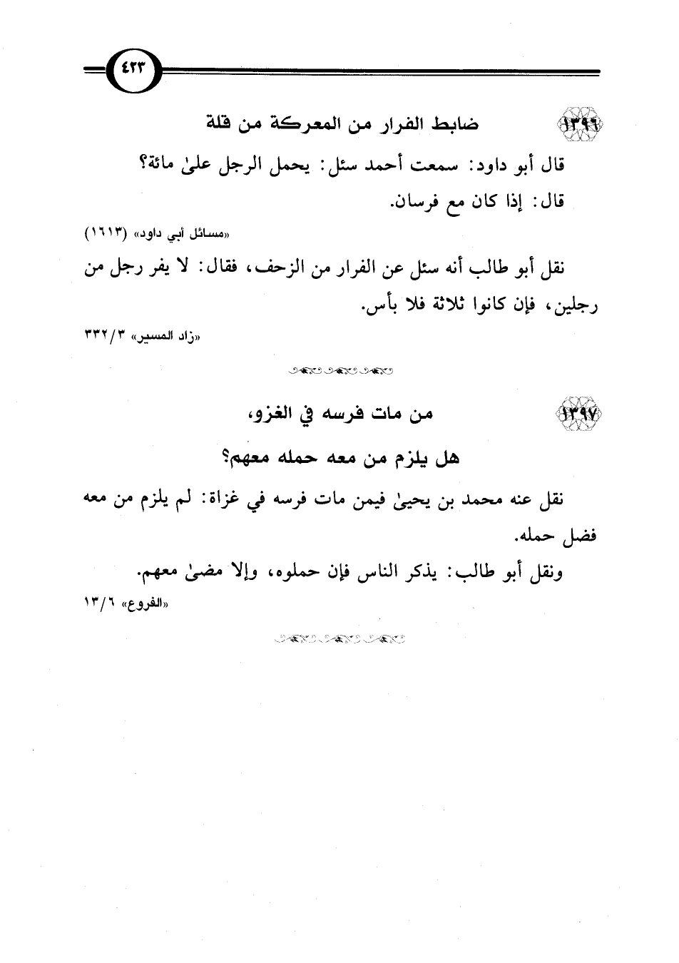 نقل أبو طالب أنه سئل عن الفرار من الزحف، فقال: لا يفر رجل من رجلين، فإن كانوا ثلاثة فلا بأس.