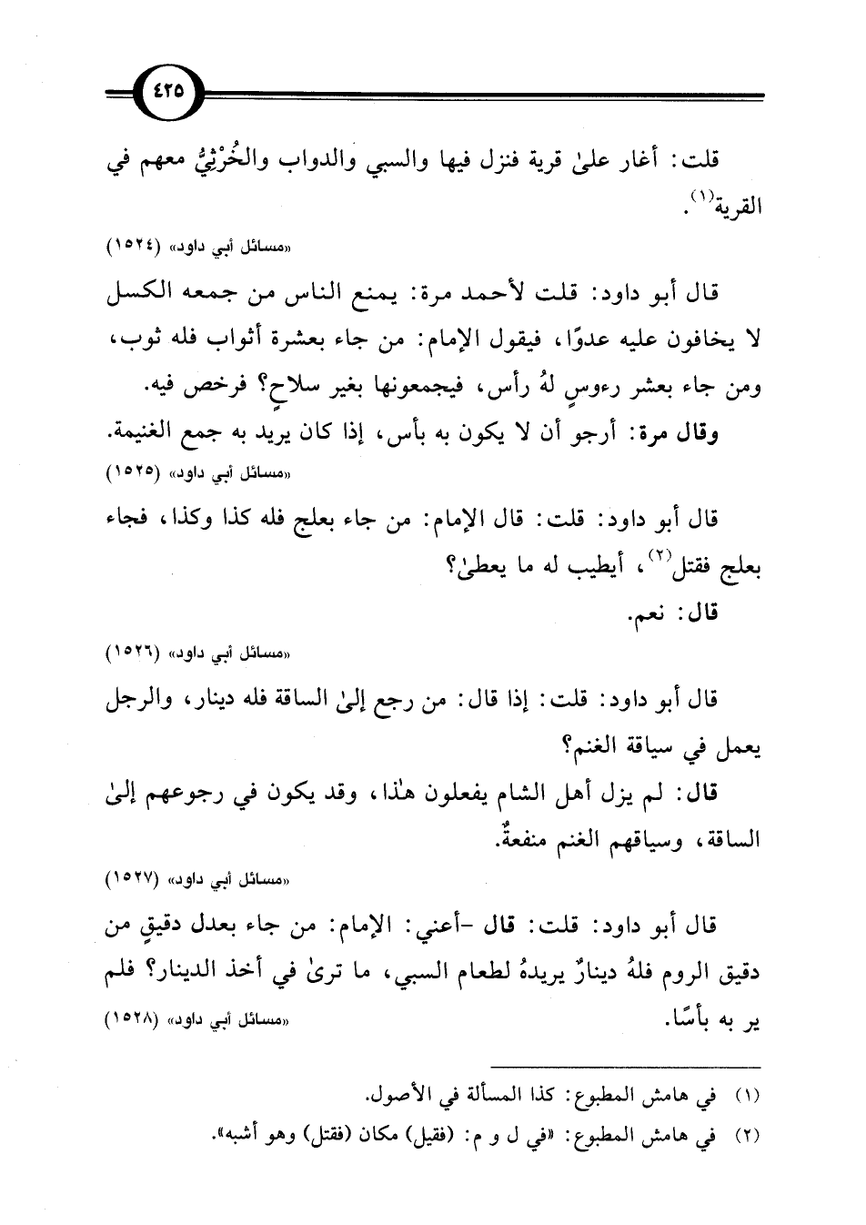 قال أبو داود: قلت لأحمد مرة: يمنع الناس من جمعه الكسل لا يخافون عليه عدوًا، فيقول الإمام: من جاء بعشرة أثواب فله ثوب، ومن جاء بعشر رءوسٍ لهُ رأس، فيجمعونها بغير سلاحٍ؟ فرخص فيه.