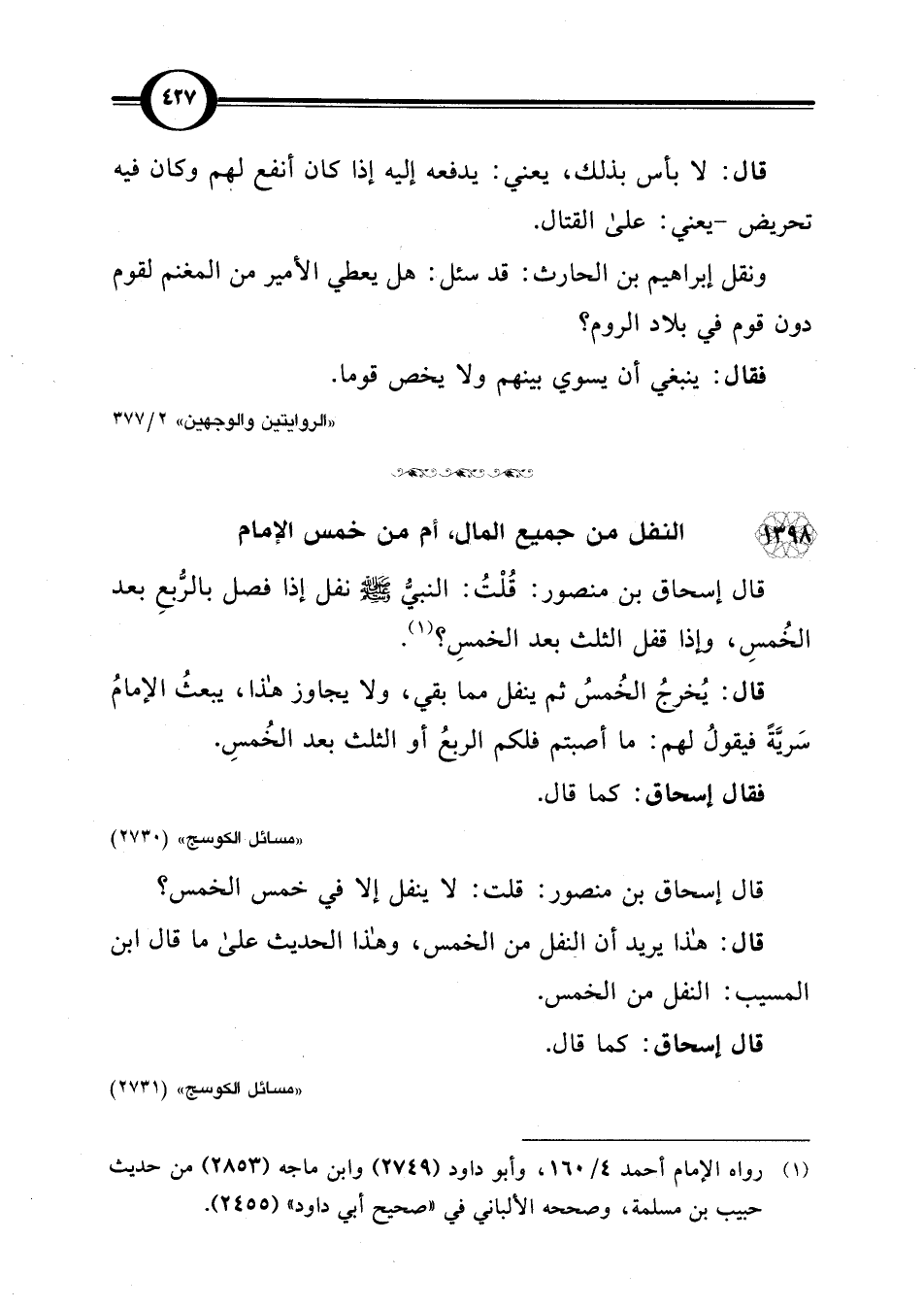 قال إسحاق بن منصور: قُلْتُ: النبيُّ -صلى اللَّه عليه وسلم- نفل إذا فصل بالرُّبعِ بعد الخُمسِ، وإذا قفل الثلث بعد الخمسِ؟ (¬1).
