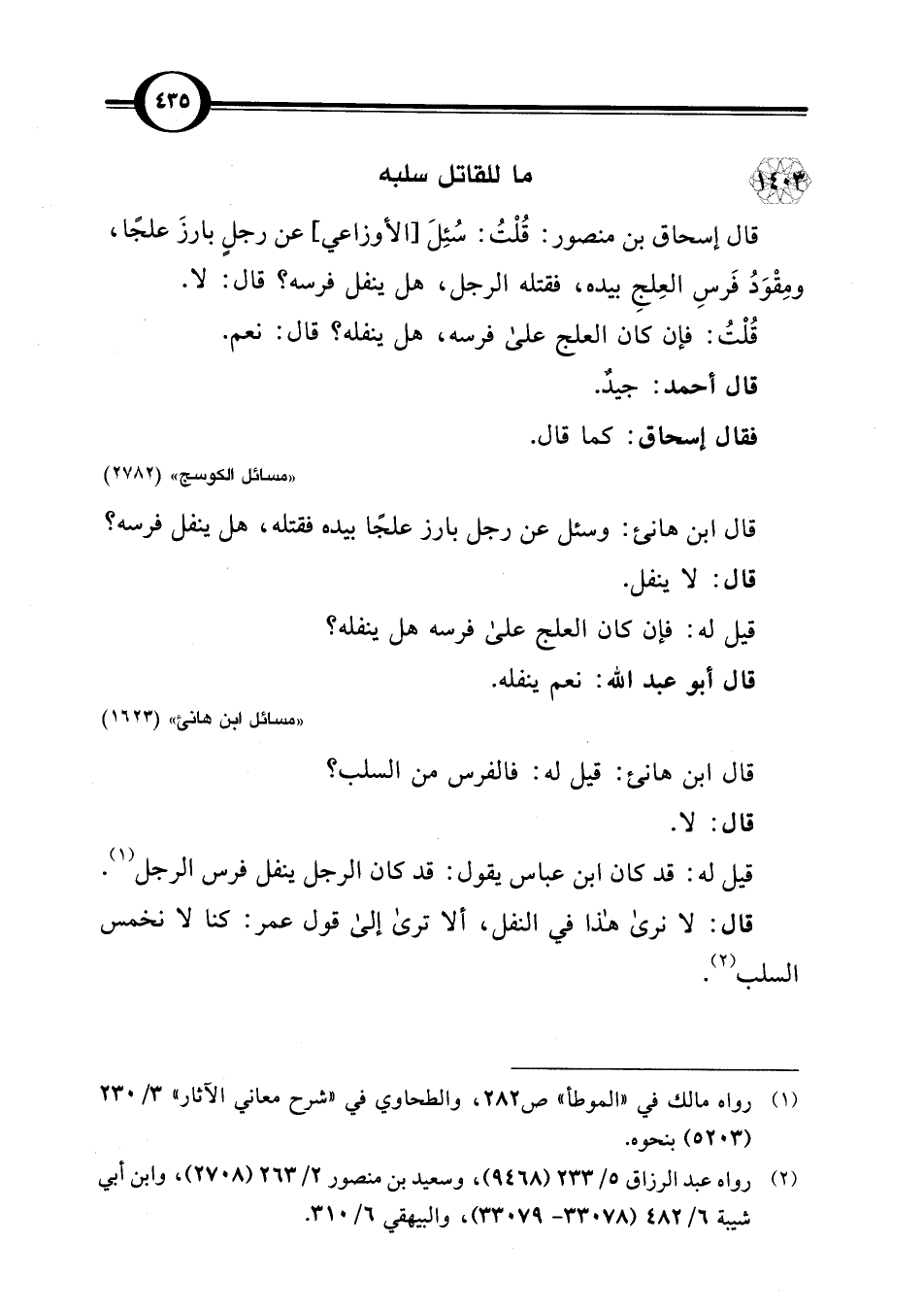 قال إسحاق بن منصور: قُلْتُ: سُئِلَ [الأوزاعي] عن رجلٍ بارزَ علجًا، ومِقْوَدُ فَرسِ العِلجِ بيده، فقتله الرجل، هل ينفل فرسه؟ قال: لا.