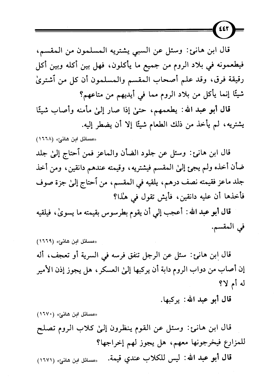 قال ابن هانئ: وسئل عن السبي يشتريه المسلمون من المقسم، فيطعمونه في بلاد الروم من جميع ما يأكلون، فهل بين أكله وبين أكل رقيقة فرق، وقد علم أصحاب المقسم والمسلمون أن كل من اشترى شيئا إنما يأكل من بلاد الروم مما في أيديهم من متاعهم؟