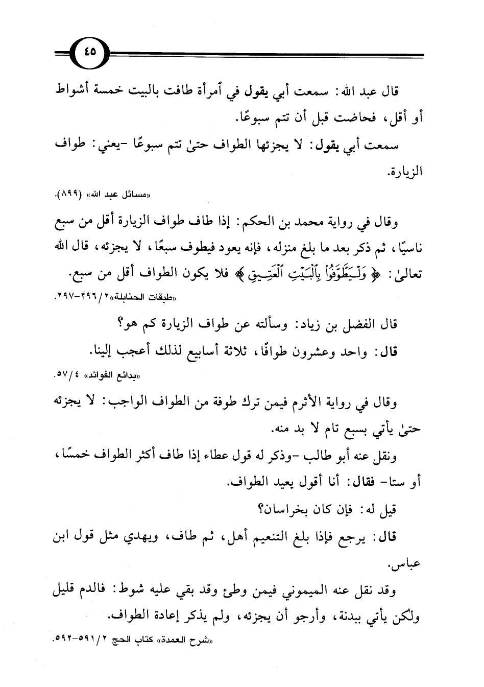 سمعت أبي يقول: لا يجزئها الطواف حتى تتم سبوعًا -يعني: طواف الزيارة.