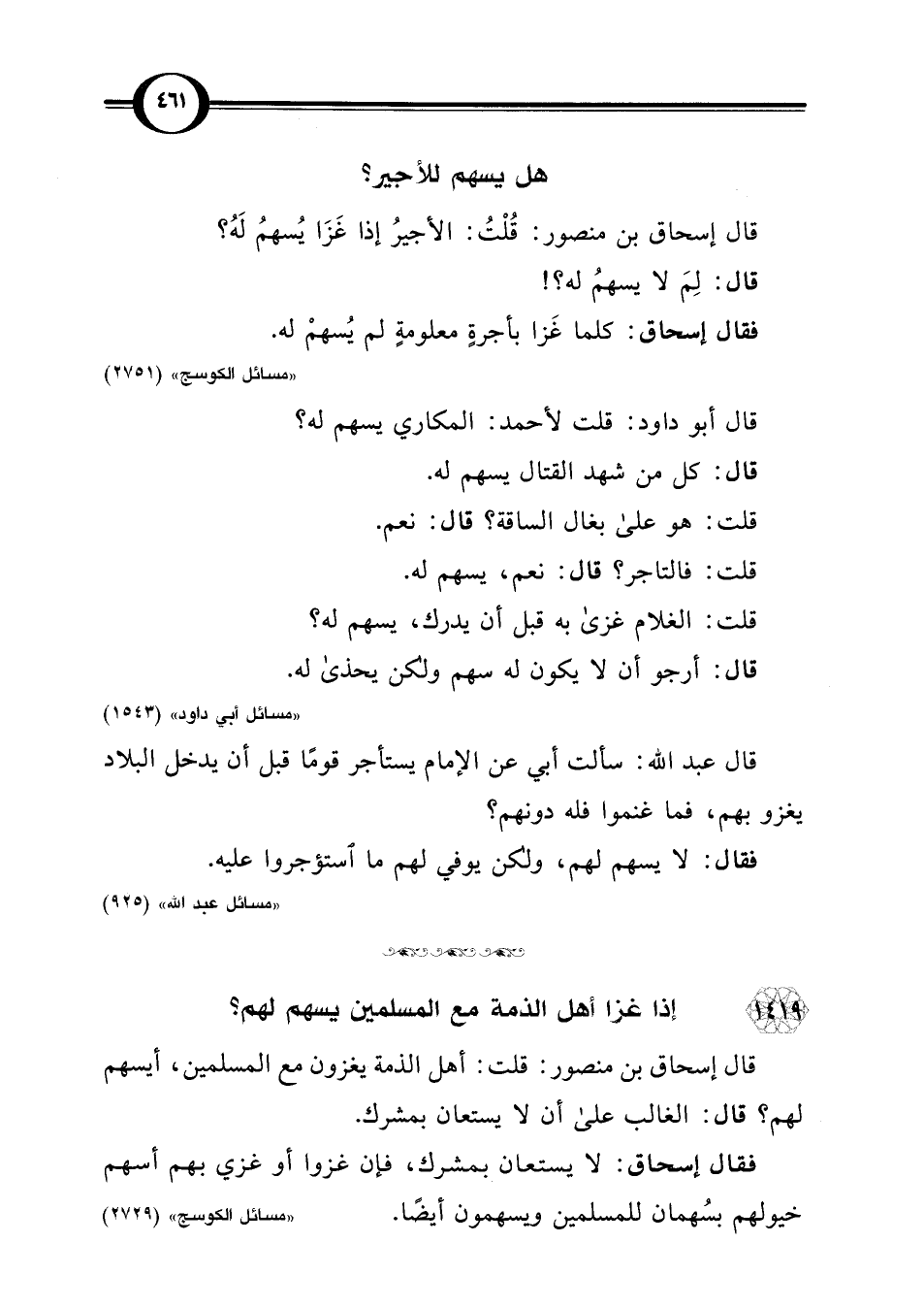 قال إسحاق بن منصور: قُلْتُ: الأجيرُ إذا غَزَا يُسهمُ لَهُ؟