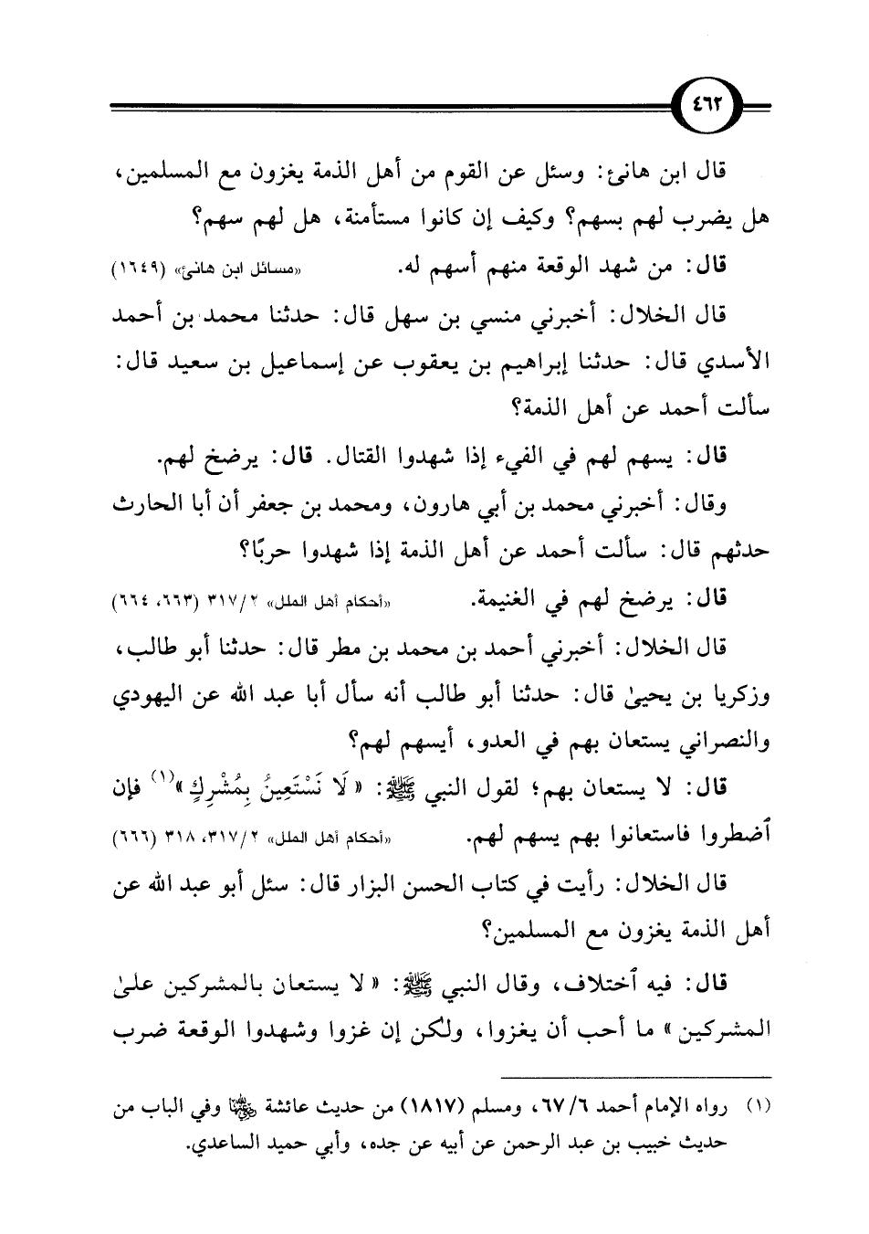 قال الخلال: أخبرني أحمد بن محمد بن مطر قال: حدثنا أبو طالب، وزكريا بن يحيى قال: حدثنا أبو طالب أنه سأل أبا عبد اللَّه عن اليهودي والنصراني يستعان بهم في العدو، أيسهم لهم؟