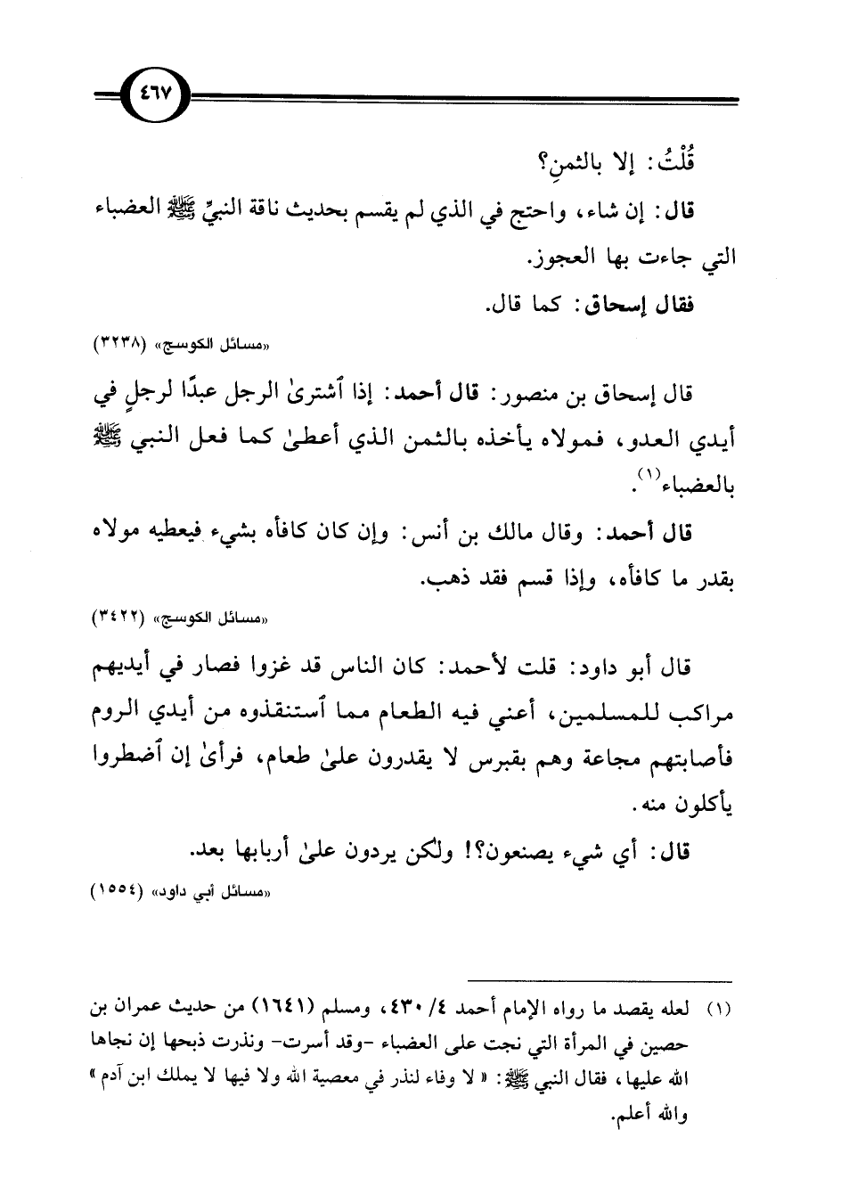 قال إسحاق بن منصور: قال أحمد: إذا اشترى الرجل عبدًا لرجلٍ في أيدي العدو، فمولاه يأخذه بالثمن الذي أعطى كما فعل النبي -صلى اللَّه عليه وسلم- بالعضباء (¬1).