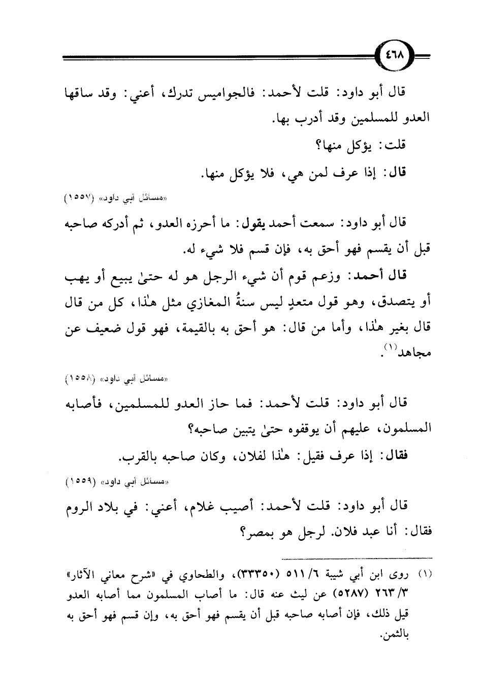قال أبو داود: قلت لأحمد: فما حاز العدو للمسلمين، فأصابه المسلمون، عليهم أن يوقفوه حتى يتبين صاحبه؟