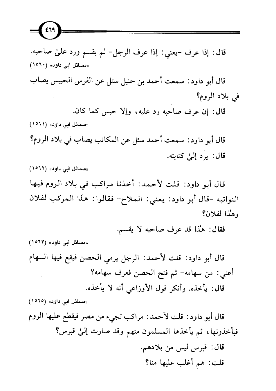 قال أبو داود: قلت لأحمد: مراكب تجيء من مصر فيقطع عليها الروم فيأخذونها، ثم يأخذها المسلمون منهم وقد صارت إلى قبرس؟