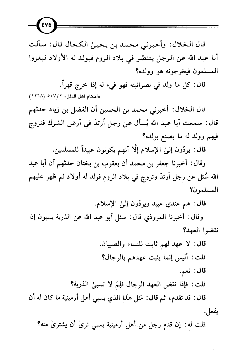 قال الخلال: وأخبرني محمد بن يحيى الكحال قال: سألت أبا عبد اللَّه عن الرجل يتنصّر في بلاد الروم فيولد له الأولاد فيغزوا المسلمون فيخرجونه هو وولده؟