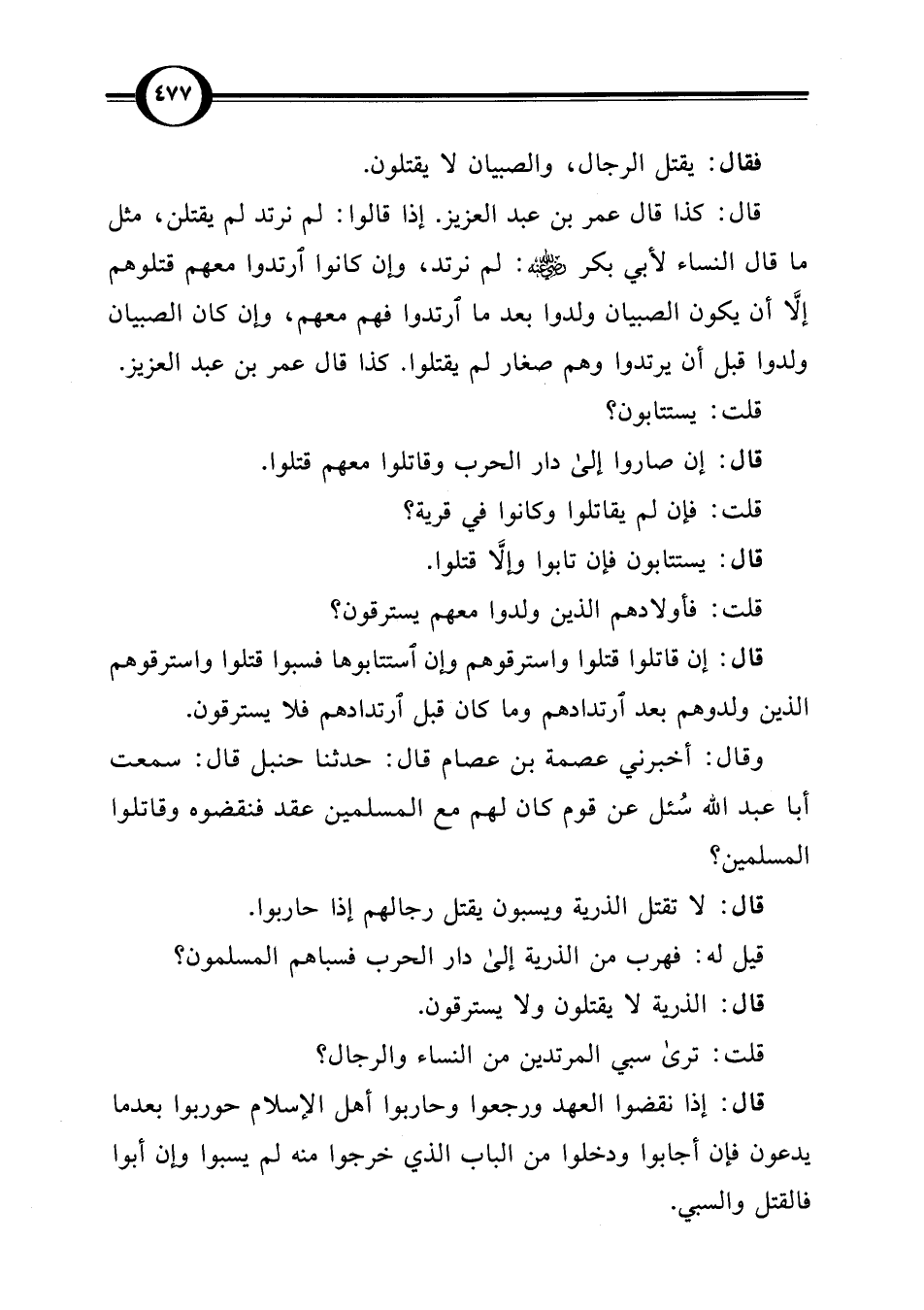 قال: إن قاتلوا قتلوا واسترقوهم وإن استتابوها فسبوا قتلوا واسترقوهم الذين ولدوهم بعد ارتدادهم وما كان قبل ارتدادهم فلا يسترقون.