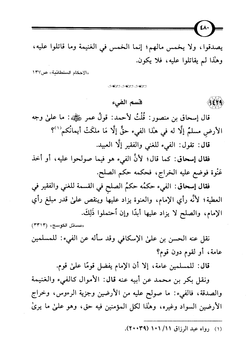 قال إسحاق بن منصور: قُلْتُ لأحمد: قولُ عمر -رضي اللَّه عنه-: ما على وجه الأرضِ مسلم إلَّا له في هذا الفيء حقّ إلَّا مَا ملكَتْ أيمانُكم (¬1)؟