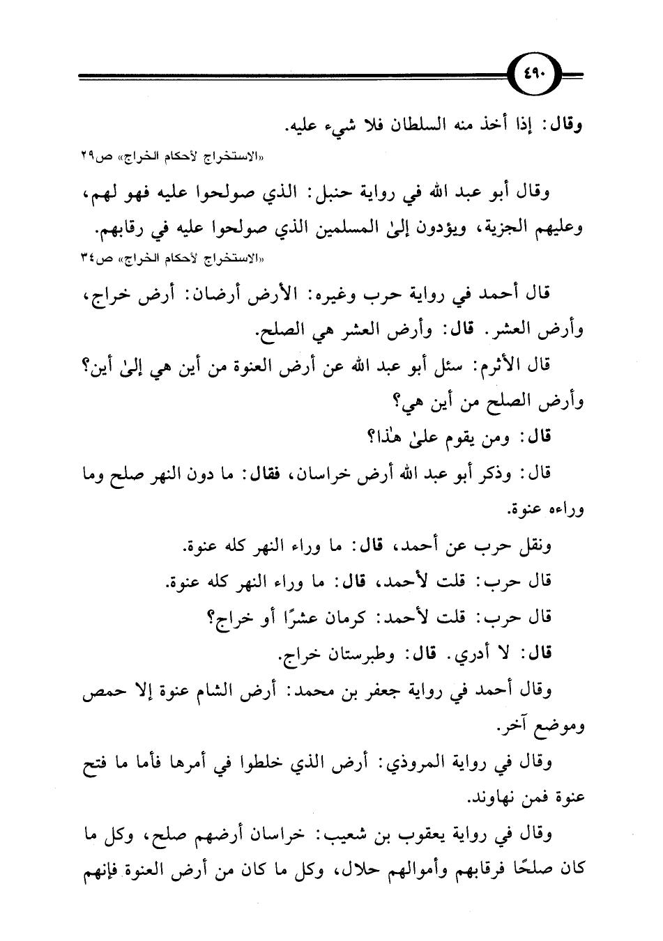 وقال في رواية يعقوب بن شعيب: خراسان أرضهم صلح، وكل ما كان صلحًا فرقابهم وأموالهم حلال، وكل ما كان من أرض العنوة فإنهم