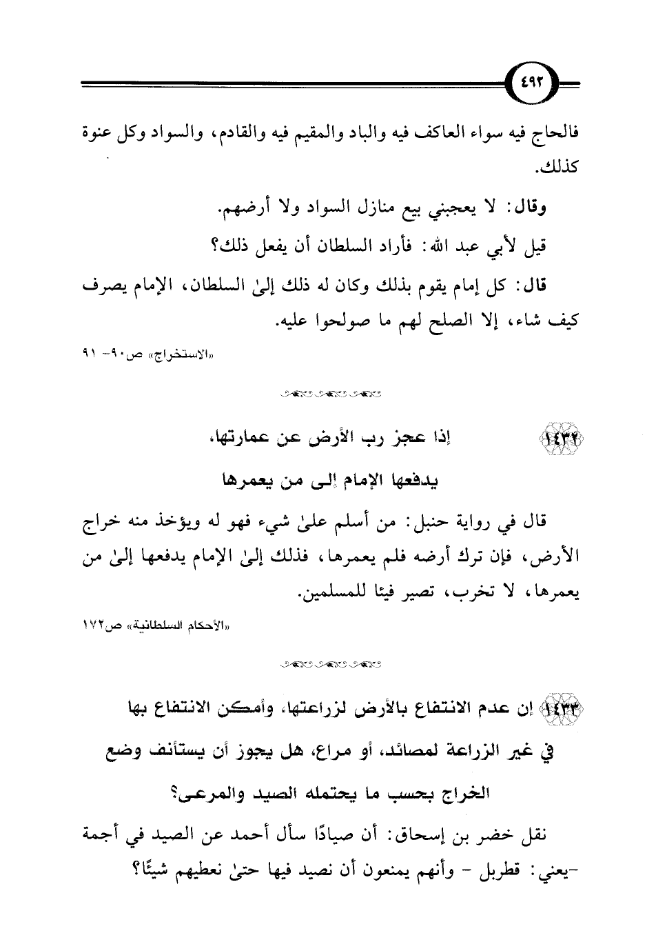 1433 - إن عدم الانتفاع بالأرض لزراعتها، وأمكن الانتفاع بها في غير الزراعة لمصائد، أو مراع، هل يجوز أن يستأنف وضع الخراج بحسب ما يحتمله الصيد والمرعى؟