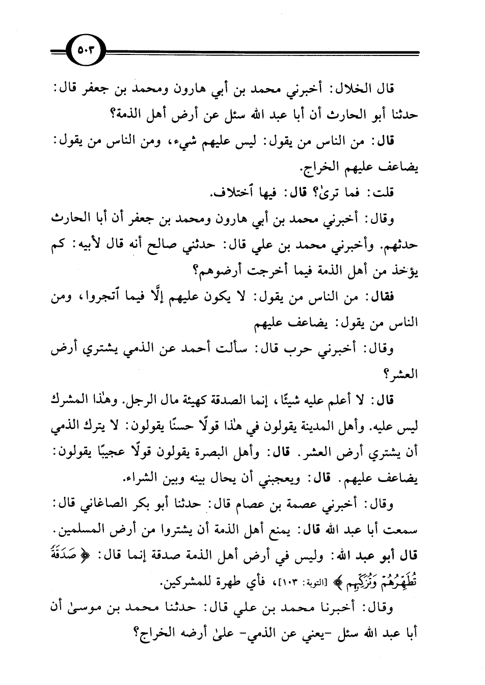 وقال: أخبرني عصمة بن عصام قال: حدثنا أبو بكر الصاغاني قال: سمعت أبا عبد اللَّه قال: يمنع أهل الذمة أن يشتروا من أرض المسلمين. قال أبو عبد اللَّه: وليس في أرض أهل الذمة صدقة إنما قال: {صَدَقَةً تُطَهِّرُهُمْ وَتُزَكِّيهِمْ} [التوبة: 103]، فأي طهرة للمشركين.