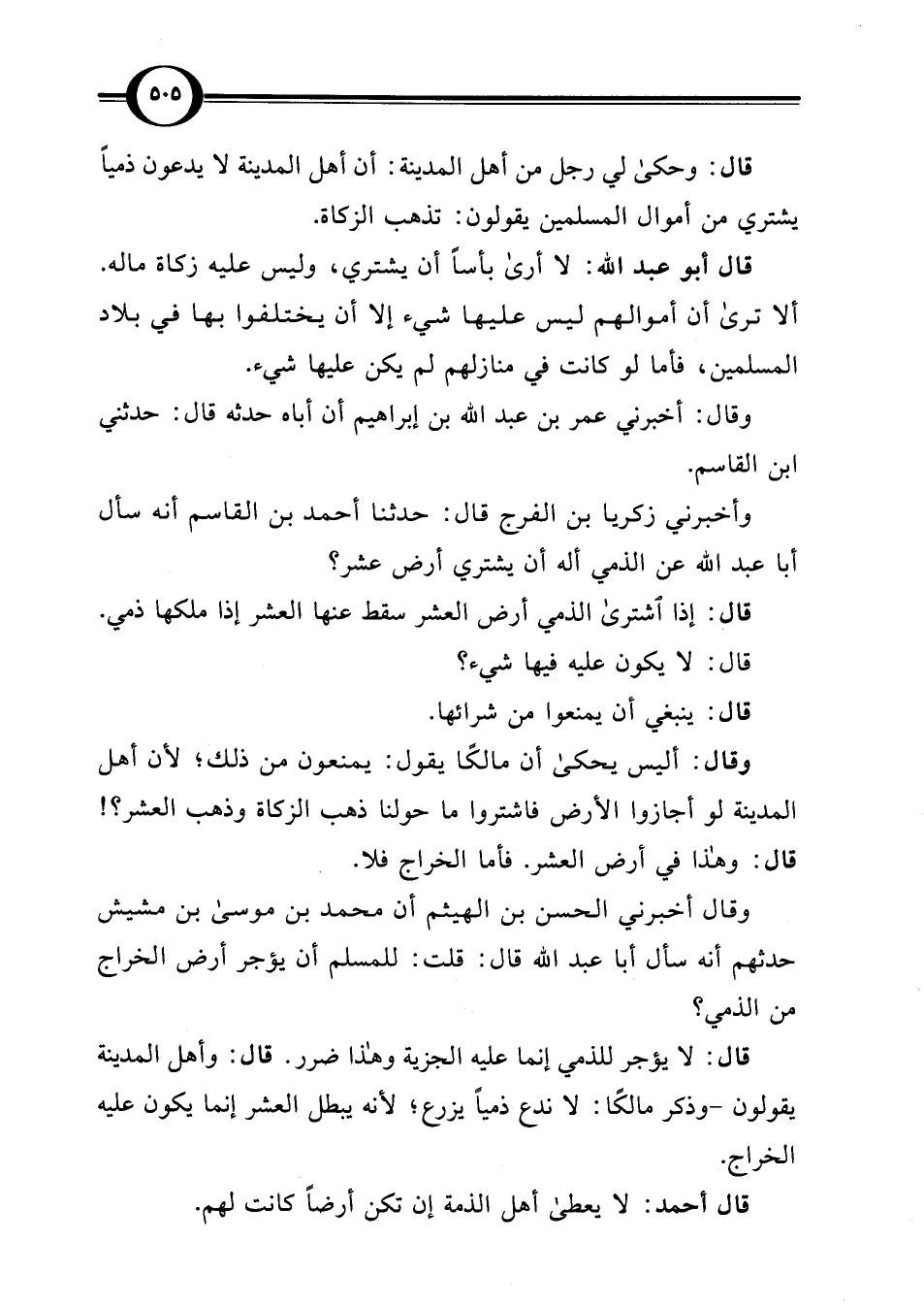 وأخبرني زكريا بن الفرج قال: حدثنا أحمد بن القاسم أنه سأل أبا عبد اللَّه عن الذمي أله أن يشتري أرض عشر؟