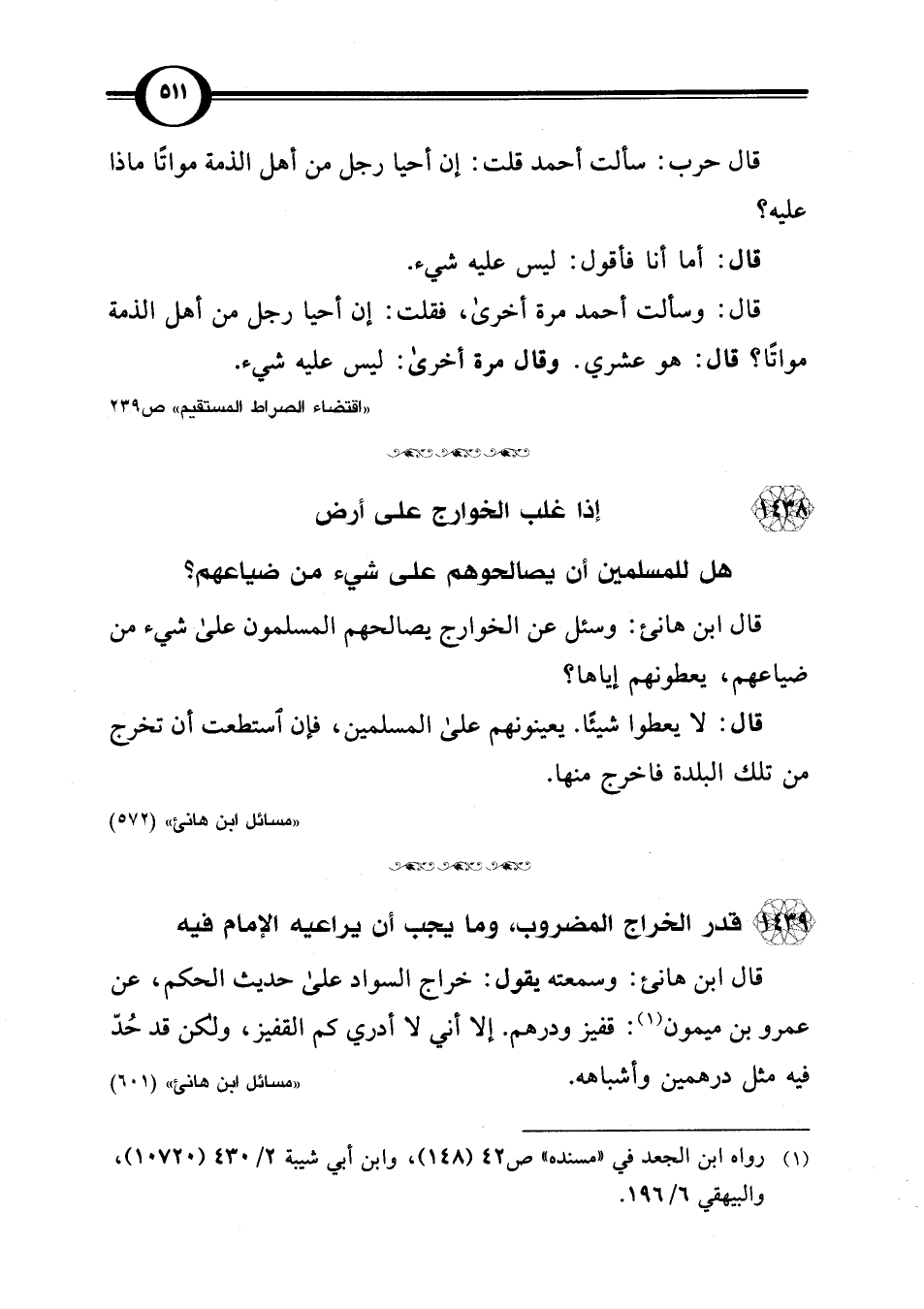 قال ابن هانئ: وسمعته يقول: خراج السواد على حديث الحكم، عن عمرو بن ميمون (¬1): قفيز ودرهم. إلا أني لا أدري كم القفيز، ولكن قد حُدّ فيه مثل درهمين وأشباهه.