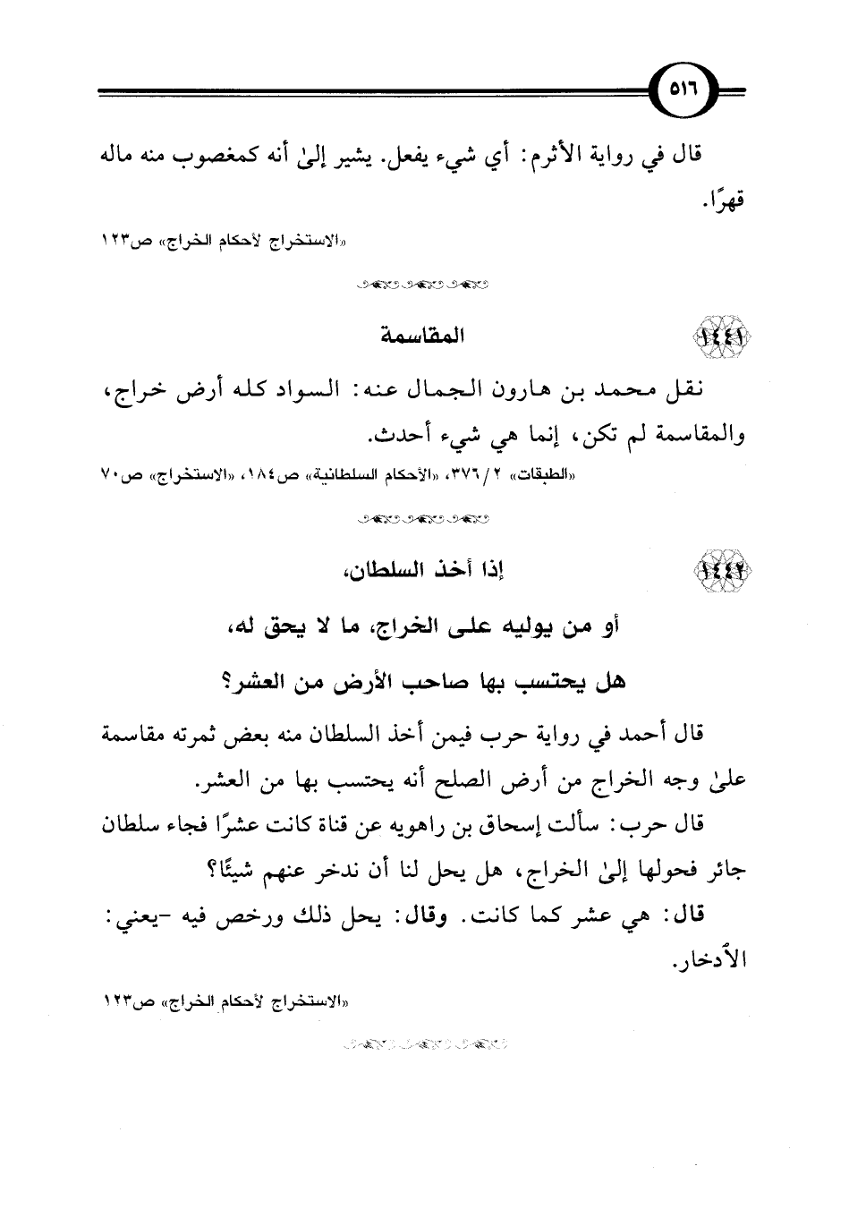 نقل محمد بن هارون الجمال عنه: السواد كله أرض خراج، والمقاسمة لم تكن، إنما هي شيء أحدث.