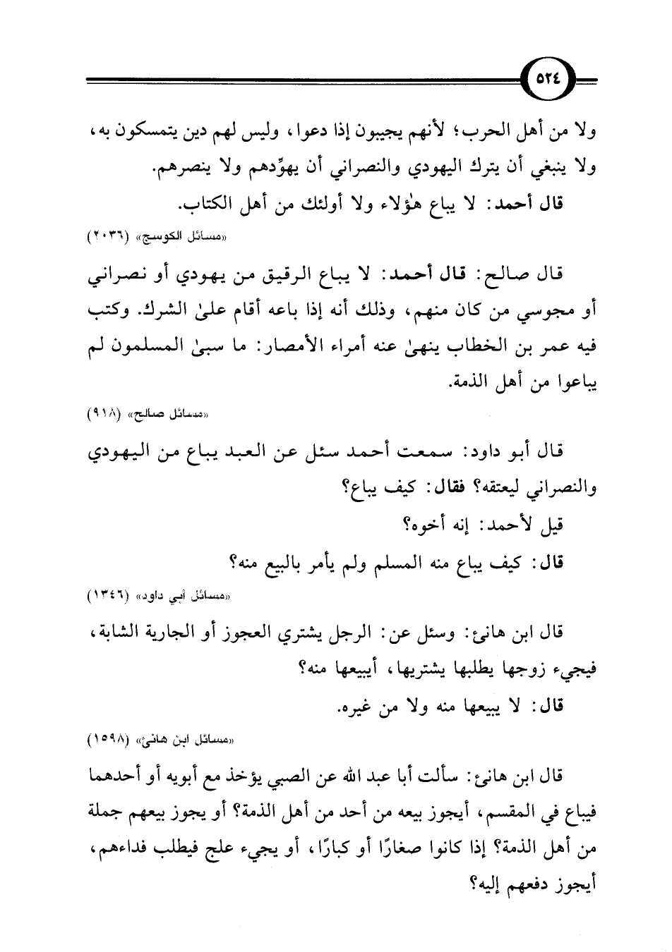 قال صالح: قال أحمد: لا يباع الرقيق من يهودي أو نصراني أو مجوسي من كان منهم، وذلك أنه إذا باعه أقام على الشرك. وكتب فيه عمر بن الخطاب ينهى عنه أمراء الأمصار: ما سبى المسلمون لم يباعوا من أهل الذمة.