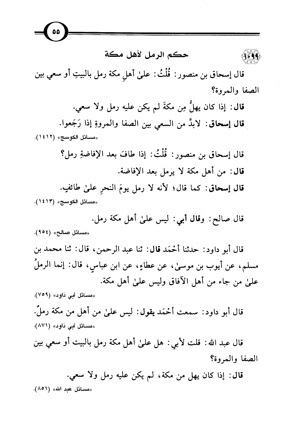 قال إسحاق بن منصور: قُلْتُ: على أهلِ مكة رمل بالبيتِ أو سعي بين الصفا والمروة؟