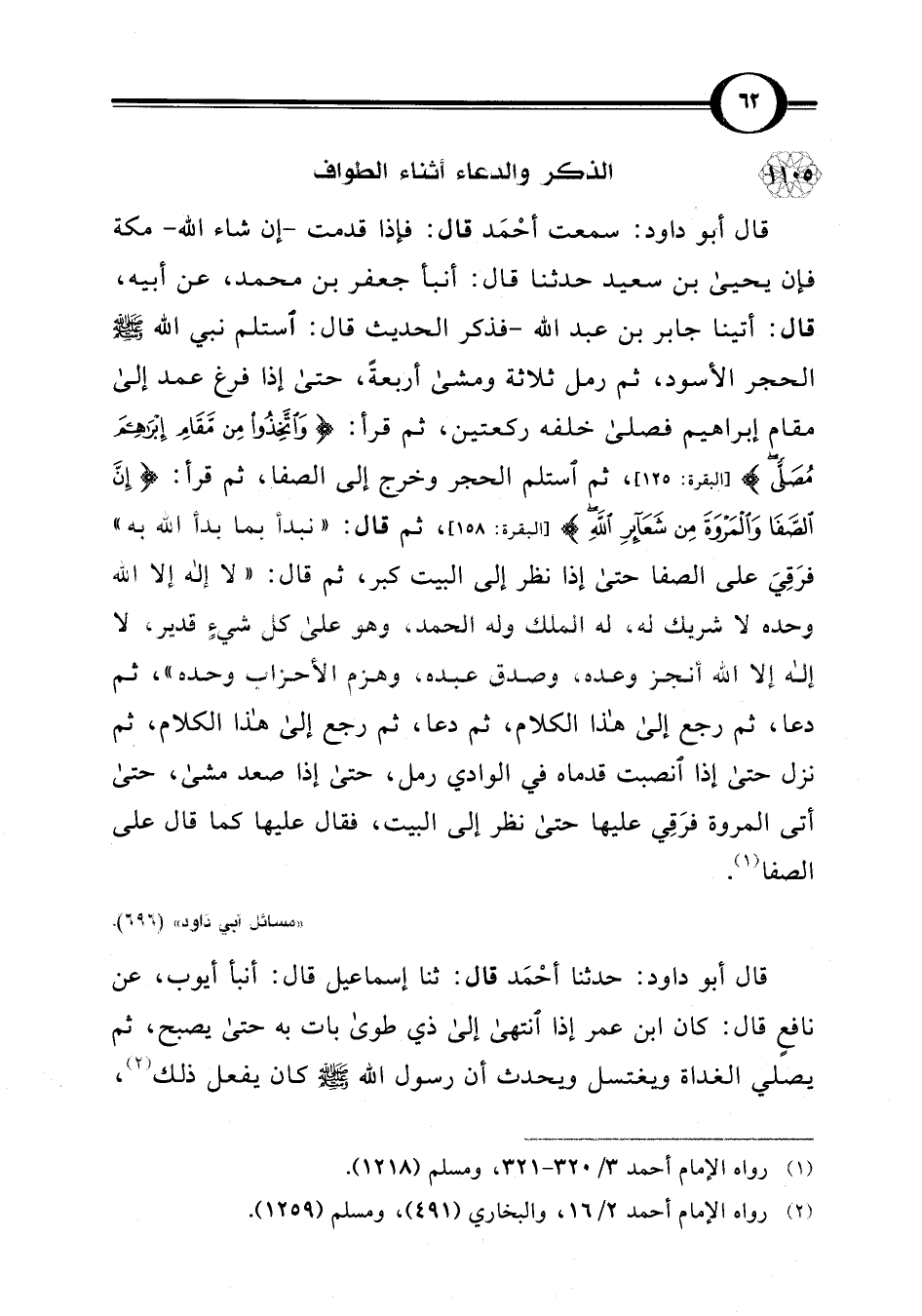قال أبو داود: سمعت أحْمَد قال: فإذا قدمت -إن شاء اللَّه- مكة فإن يحيى بن سعيد حدثنا قال: أنبا جعفر بن محمد، عن أبيه، قال: أتينا جابر بن عبد اللَّه -فذكر الحديث قال: استلم نبي اللَّه -صلى اللَّه عليه وسلم- الحجر الأسود، ثم رمل ثلاثة ومشى أربعةً، حتى إذا فرغ عمد إلى مقام إبراهيم فصلى خلفه ركعتين، ثم قرأ: {وَاتَّخِذُوا مِنْ مَقَامِ إِبْرَاهِيمَ مُصَلًّى} [البقرة: 125]، ثم استلم الحجر وخرج إلى الصفا، ثم قرأ: {إِنَّ الصَّفَا وَالْمَرْوَةَ مِنْ شَعَائِرِ اللَّهِ} [البقرة: 158]، ثم قال: "نبدأ بما بدأ اللَّه به" فرَقِيَ على الصفا حتى إذا نظر إلى البيت كبر، ثم قال: "لا إله إلا اللَّه وحده لا شريك له، له الملك وله الحمد، وهو على كل شيءٍ قدير، لا إله اللَّه أنجز وعده، وصدق عبده، وهزم الأحزاب وحده"، ثم دعا، ثم رجع إلى هذا الكلام، ثم دعا، ثم رجع إلى هذا الكلام، ثم نزل حتى إذا انصبت قدماه في الوادي رمل، حتى إذا صعد مشى، حتى أتى المروة فرَقِي عليها حتى نظر إلى البيت، فقال عليها كما قال على الصفا (¬1).