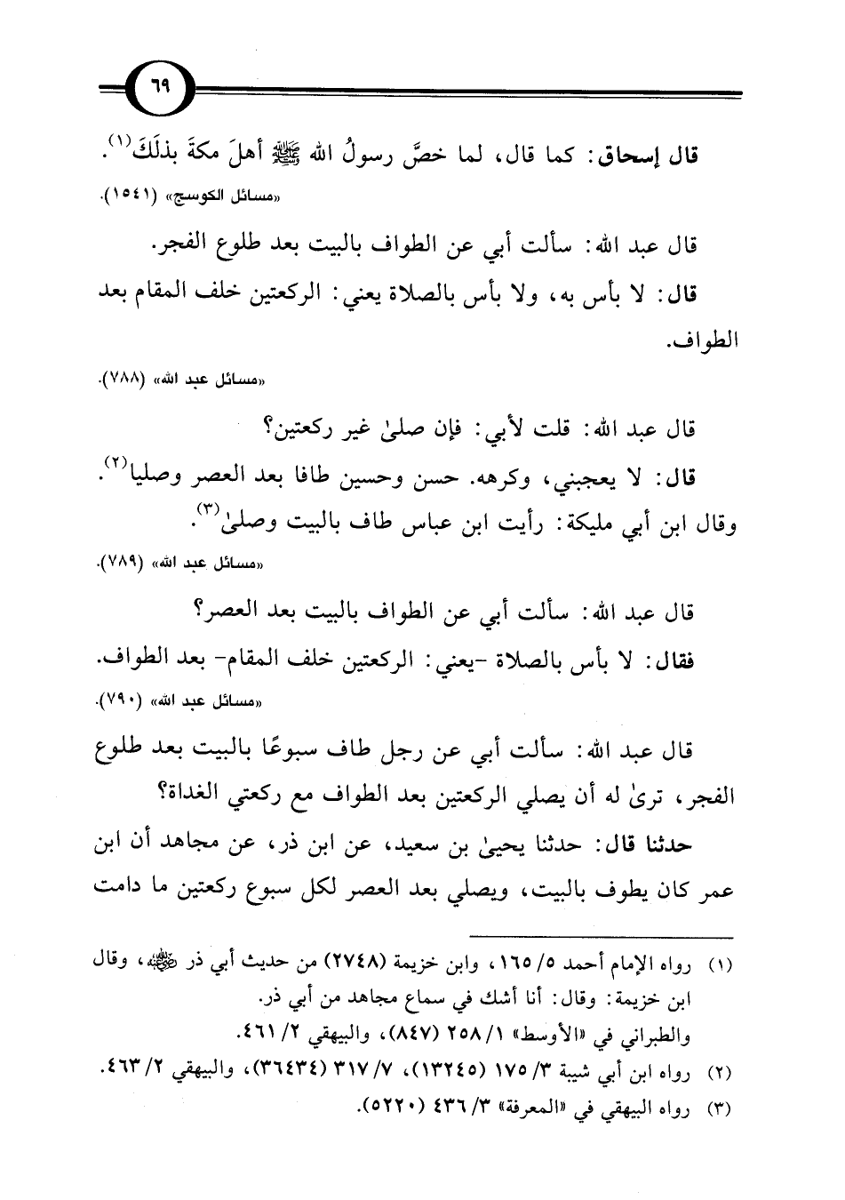 قال عبد اللَّه: سألت أبي عن رجل طاف سبوعًا بالبيت بعد طلوع الفجر، ترى له أن يصلي الركعتين بعد الطواف مع ركعتي الغداة؟