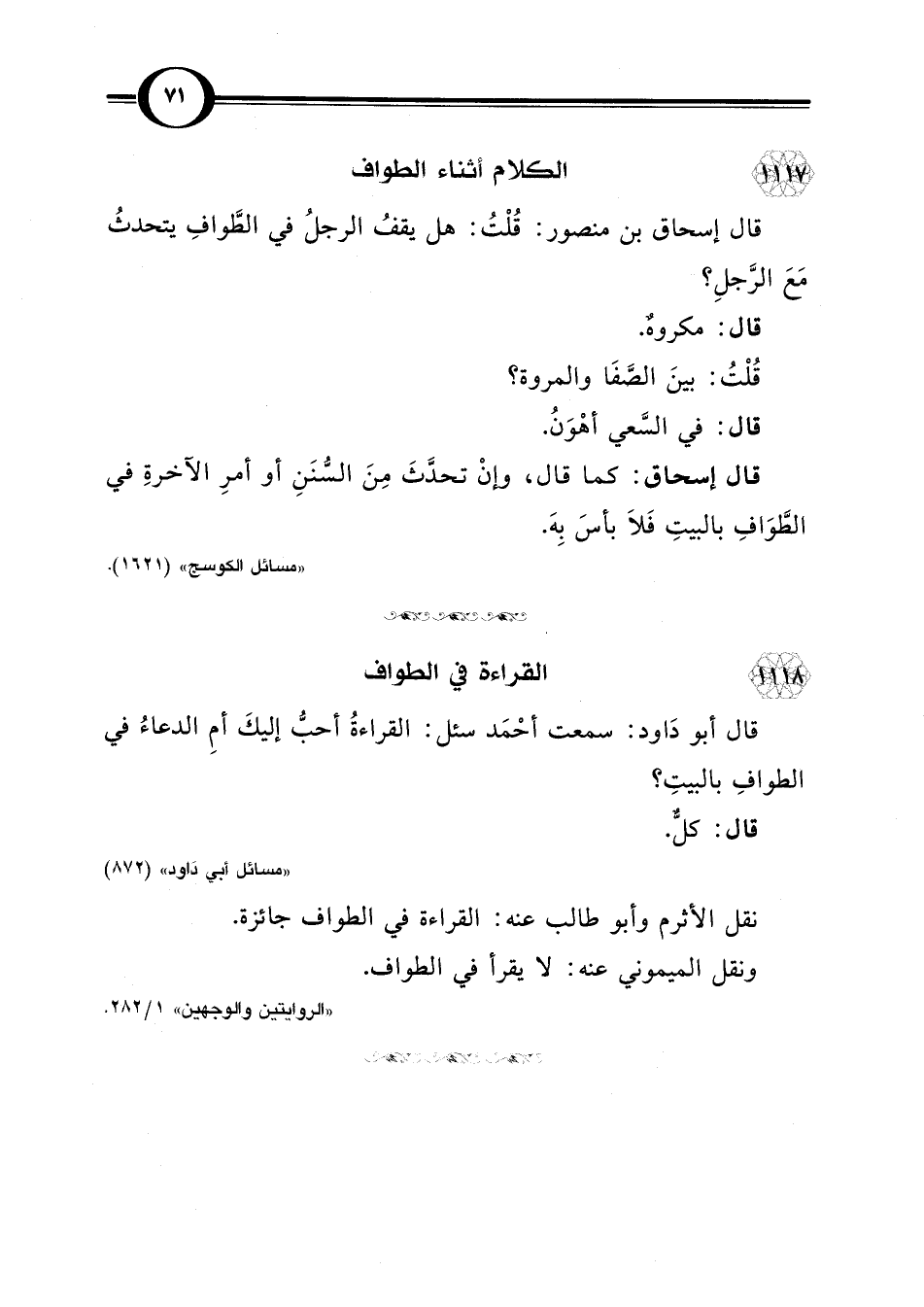 قال إسحاق بن منصور: قُلْتُ: هل يقفُ الرجلُ في الطَّوافِ يتحدثُ مَعَ الرَجلِ؟
