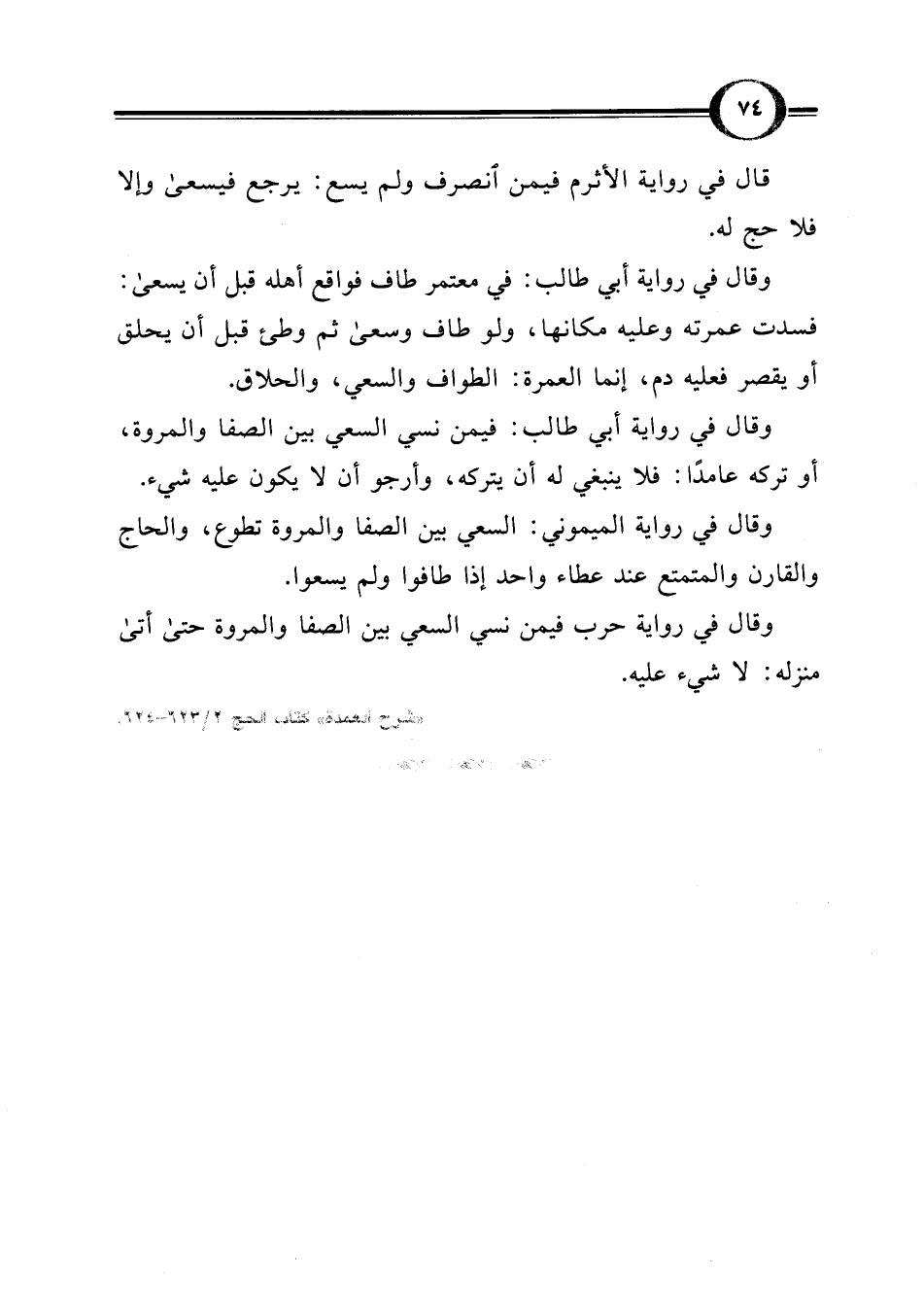 وقال في رواية أبي طالب: فيمن نسي السعي بين الصفا والمروة، أو تركه عامدًا: فلا ينبغي له أن يتركه، وأرجو أن لا يكون عليه شيء.