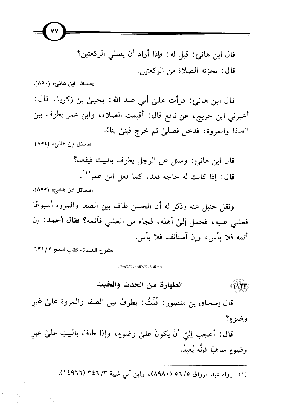 قال إسحاق بن منصور: قُلْتُ: يطوفُ بين الصفا والمروة على غيرِ وضوءٍ؟