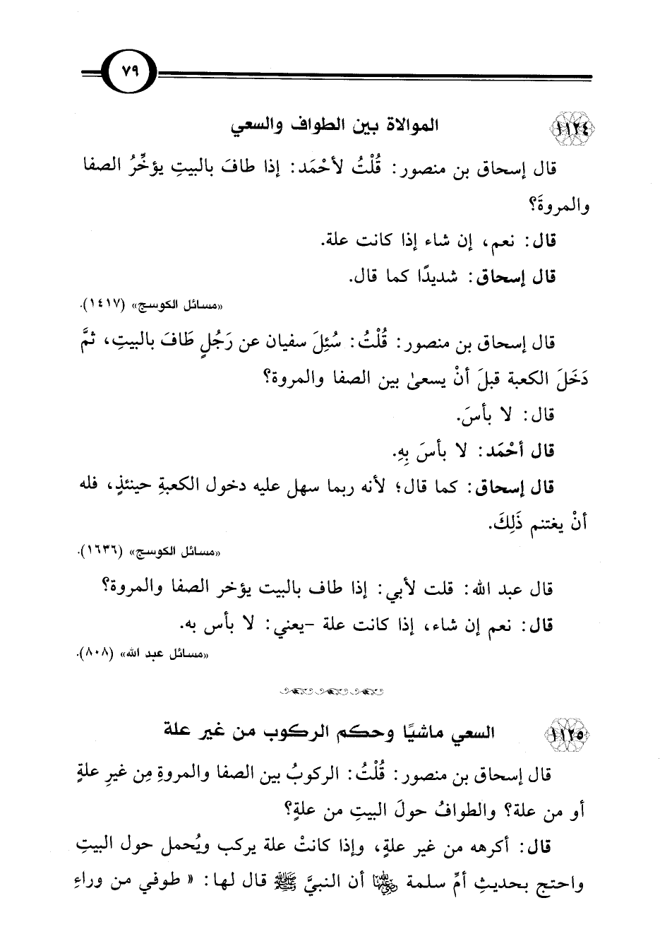 قال إسحاق بن منصور: قُلْتُ: الركوبُ بين الصفا والمروةِ مِن غيرِ علةٍ أو من علة؟ والطوافُ حولَ البيتِ من علةٍ؟