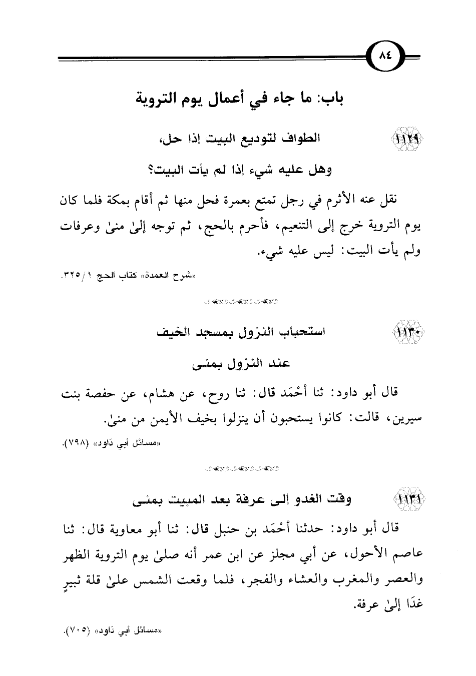 قال أبو داود: حدثنا أحْمَد بن حنبل قال: ثنا أبو معاوية قال: ثنا عاصم الأحول، عن أبي مجلز عن ابن عمر أنه صلى يوم التروية الظهر والعصر والمغرب والعشاء والفجر، فلما وقعت الشمس على قلة ثبيرٍ غدَا إلى عرفة.