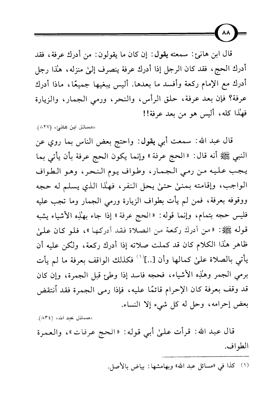 قال ابن هانئ: سمعته يقول: إن كان ما يقولون: من أدرك عرفة، فقد أدرك الحج، فقد كان الرجل إذا أدرك عرفة ينصرف إلى منزله، هذا رجل أدرك مع الإمام ركعة وأفسد ما بعدها. أليس يبغيها جميعًا، ماذا أدرك عرفة؛ فإن بعد عرفة، حلق الرأس، والنحر، ورمي الجمار، والزيارة فهذا كله، أليس هو من بعد عرفة! !