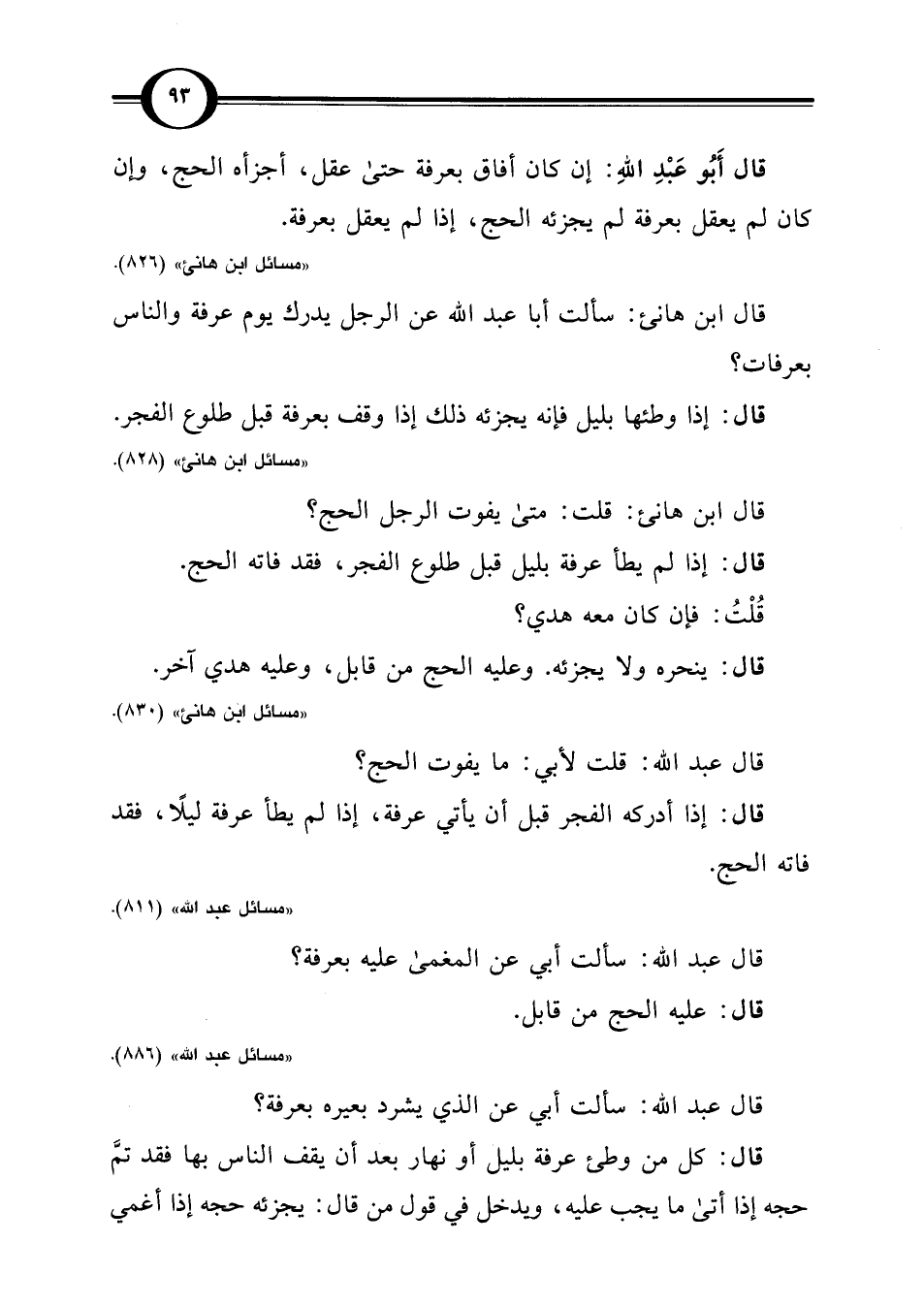 قال ابن هانئ: سألت أبا عبد اللَّه عن الرجل يدرك يوم عرفة والناس بعرفات؟