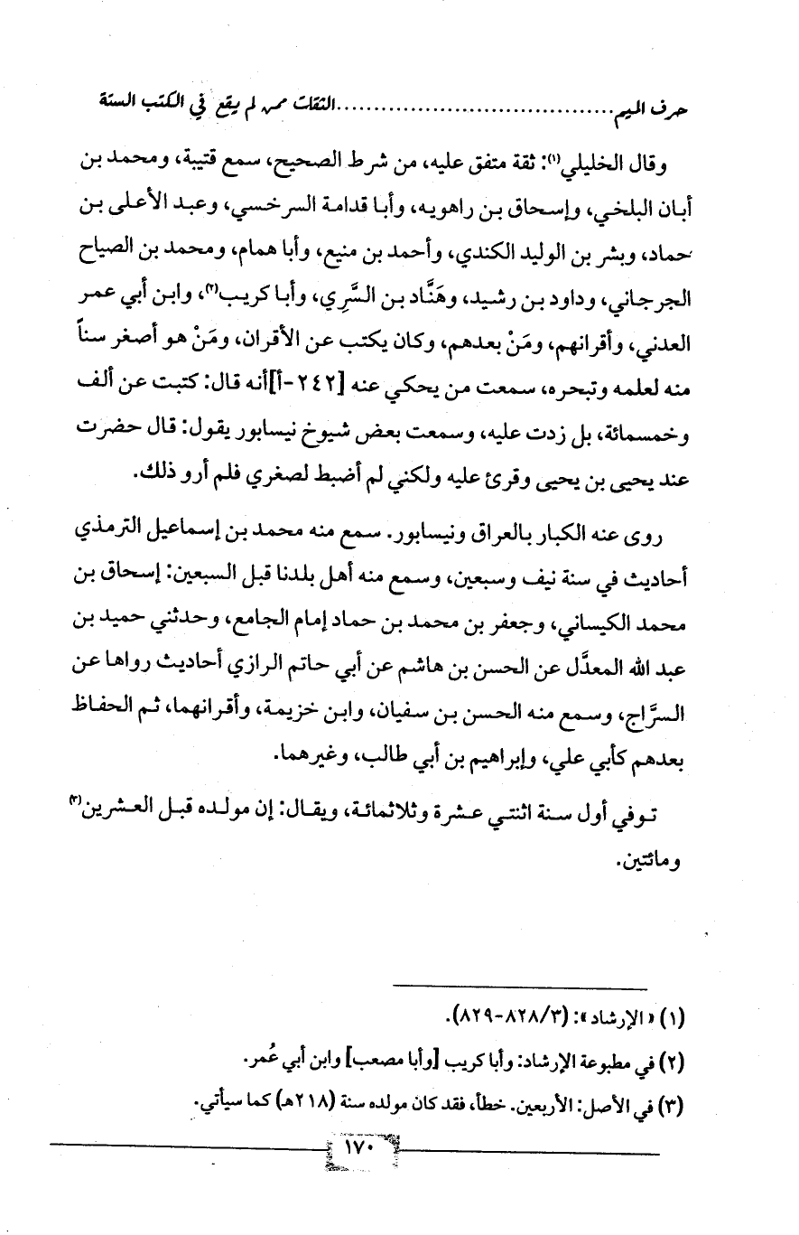 وقال الخليلي (¬1): ثقة متفق عليه، من شرط الصحيح، سمع قتيبة، ومحمد بن أبان البلخي، وإسحاق بن راهويه، وأبا قدامة السرخسي، وعبد الأعلى بن حماد، وبشر بن الوليد الكندي، وأحمد بن منيع، وأبا همام، ومحمد بن الصياح الجرجاني، وداود بن رشيد، وهَنَّاد بن السَّرِي، وأبا كريب (¬2)، وابن أبي عمر العدني، وأقرانهم، ومَنْ بعدهم، وكان يكتب عن الأقران، ومَنْ هو أصغر سناً منه لعلمه وتبحره، سمعت من يحكي عنه [242 - أ] أنه قال: كتبت عن ألف وخمسمائة، بل زدت عليه، وسمعت بعض شيوخ نيسابور يقول: قال حضرت عند يحيى بن يحيى وقرئ عليه ولكني لم أضبط لصغري فلم أرو ذلك.
