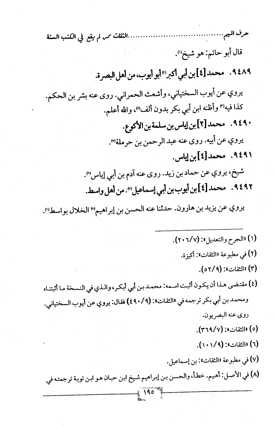 (¬4) مقتضى هذا أن يكون أثبت اسمه: محمد بن أبي أبكر، والذي في النسخة ما أثبتناه ومحمد بن أبي بكر ترجمه في «الثقات»: (9/ 490) فقال: يروي عن أيوب السختياني. روى عنه البصريون.