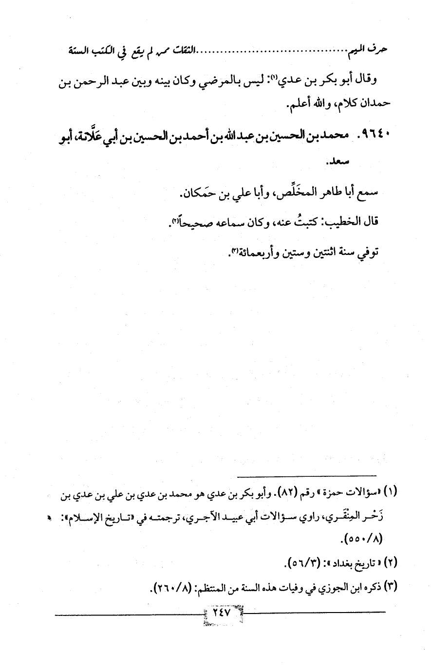 (¬1) «سؤالات حمزة» رقم (82). وأبو بكر بن عدي هو محمد بن عدي بن علي بن عدي بن زَحْر المِنْقَري، راوي سؤالات أبي عبيد الآجري، ترجمته في «تاريخ الإسلام»: (8/ 550).