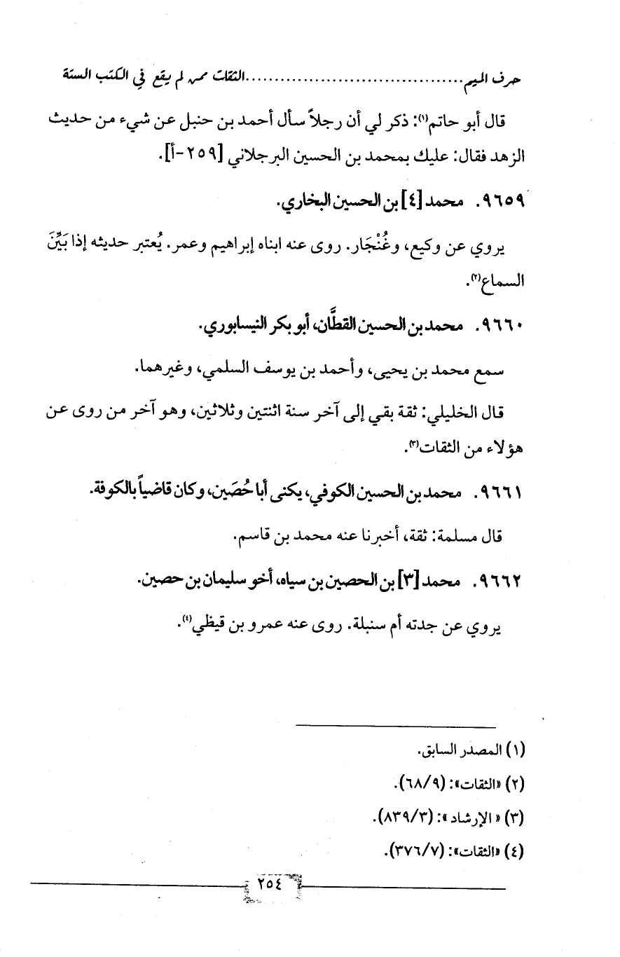 9661 - محمد بن الحسين الكوفي، يكنى أبا حُصَين، وكان قاضياً بالكوفة.