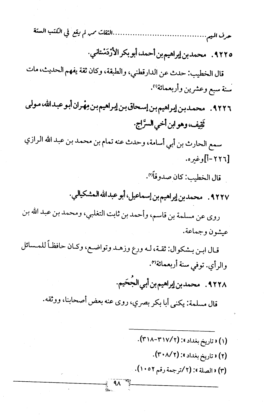 9226 - محمد بن إبراهيم بن إسحاق بن إبراهيم بن مِهْران أبو عبد الله، مولى ثَقِيف، وهو ابن أخي السرَّاج.