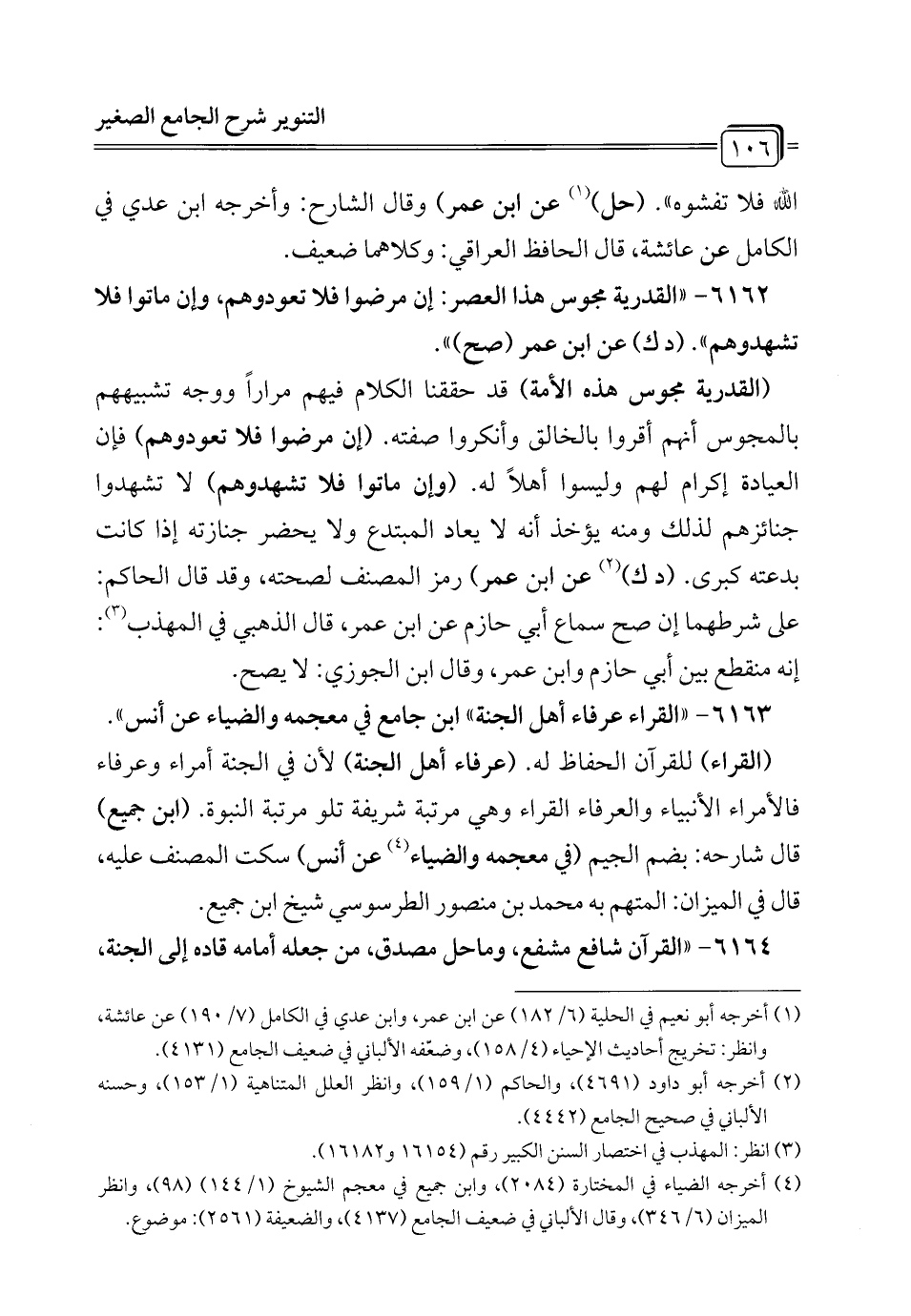 6163 - "القراء عرفاء أهل الجنة" ابن جامع في معجمه والضياء عن أنس".