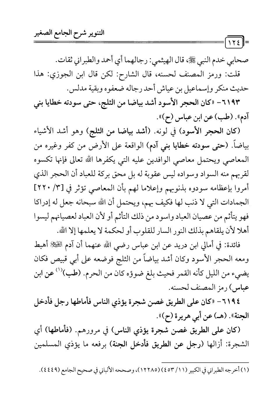 6193 - "كان الحجر الأسود أشد بياضا من الثلج، حتى سودته خطايا بني آدم". (طب) عن ابن عباس (ح) ".