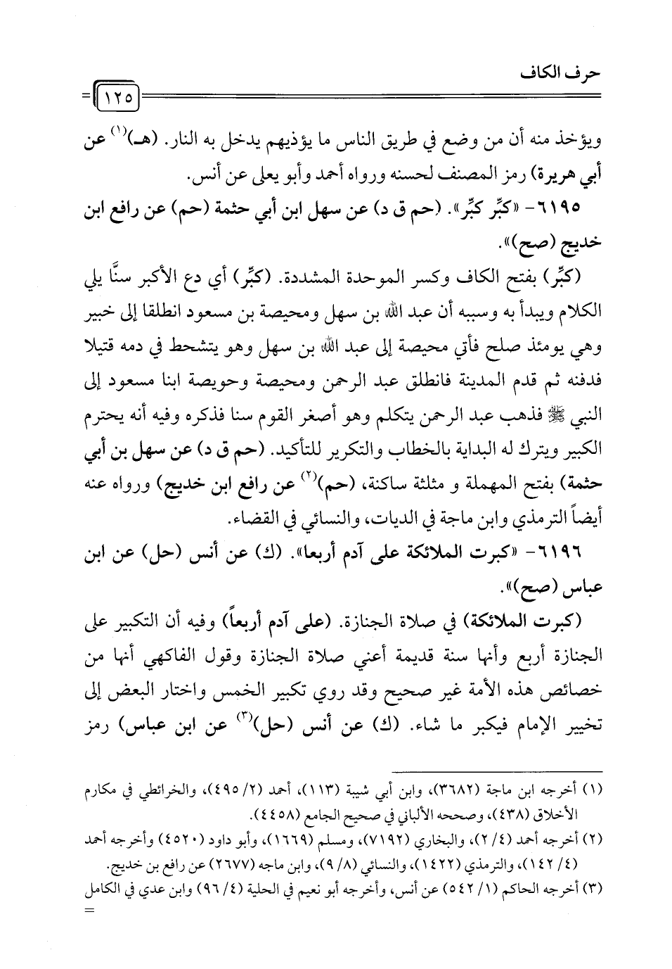 (كبِّر) بفتح الكاف وكسر الموحدة المشددة. (كبِّر) أي دع الأكبر سنًّا يلي الكلام ويبدأ به وسببه أن عبد الله بن سهل ومحيصة بن مسعود انطلقا إلى خيبر وهي يومئذ صلح فأتي محيصة إلى عبد الله بن سهل وهو يتشحط في دمه قتيلا فدفنه ثم قدم المدينة فانطلق عبد الرحمن ومحيصة وحويصة ابنا مسعود إلى النبي - صلى الله عليه وسلم - فذهب عبد الرحمن يتكلم وهو أصغر القوم سنا فذكره وفيه أنه يحترم الكبير ويترك له البداية بالخطاب والتكرير للتأكيد. (حم ق د) عن سهل بن أبي حثمة) بفتح المهملة ومثلثة ساكنة، (حم) (¬2) عن رافع ابن خديج) ورواه عنه أيضاً الترمذي وابن ماجة في الديات، والنسائي في القضاء.