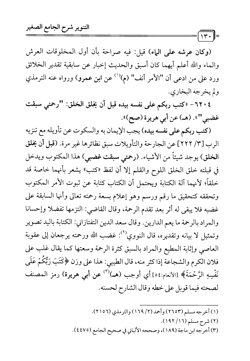 (كتب ربكم على نفسه بيده) يجب الإيمان به والسكوت عن تأويله مع تنزيه الرب [3/ 222] عن الجارحة والتأويلات سبق نظائرها غير مرة. (قبل أن يخلق الخلق) يوجد شيئاً من الأشياء. (رحمتي سبقت غضبي) هذا المكتوب ويدخل في قبلته خلق الخلق اللوح والقلم إلا أن لفظ "كتب" يشعر بأنهما خاصة قد خلقاً؛ لأنهما آلة الكتابة ويحتمل أن الكتاب كتابة عن ثبوت الأمر المكتوب وتحققه كتحقيق ما رقم ورسم وهو إعلام بسعة رحمته تعالى وأنها السابقة على غضبه فلا يبقى له أثر بعد تقدم الرحمة، وقال القاضي: التزمها تفضلا وإحسانا والمراد بالرحمة ما يعم الدارين. وقال سعد الدين التفتازاني: الكتابة باليد تصوير وتمثيل لا بيانه وتقديره، قال النووي (¬2): غضب الله ورحمته يرجعان إلى عقوبة العاصي وإثابة المطيع والمراد بالسبق كثرة الرحمة وسعتها كما يقال غلب على فلان الكرم والشجاعة إذا كثر منه، قال الطيبي: هذا على وزن {كَتَبَ رَبُّكُمْ عَلَى نَفْسِهِ الرَّحْمَةَ} [الأنعام: 54] أي أوجب (هـ) (¬3) عن أبي هريرة) رمز المصنف لصحته فيما قوبل على خطه وقال الشارح لحسنه.
