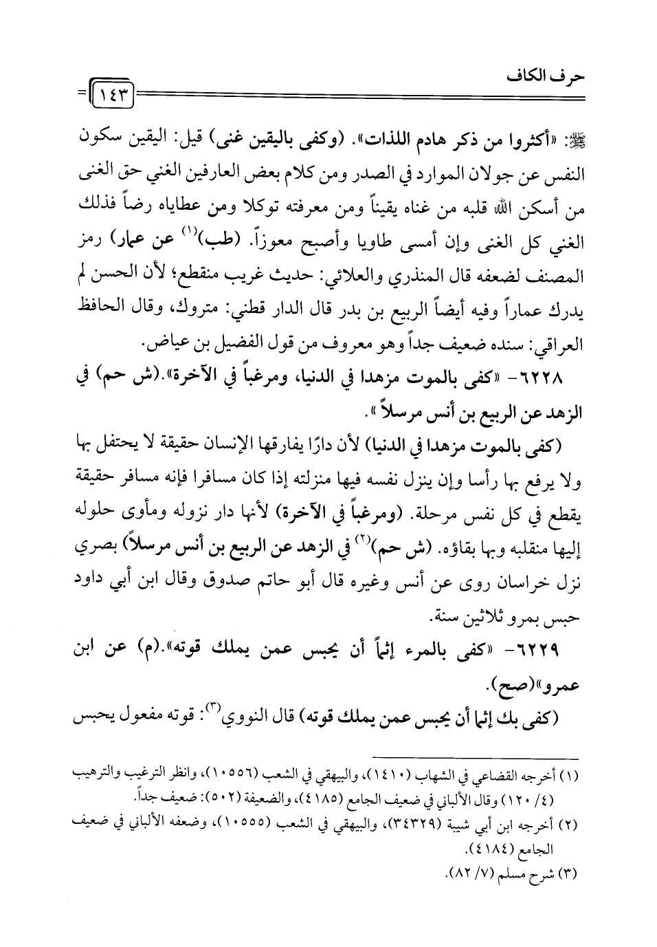 - صلى الله عليه وسلم -: "أكثروا من ذكر هادم اللذات". (وكفى باليقين غنى) قيل: اليقين سكون النفس عن جولان الموارد في الصدر ومن كلام بعض العارفين الغني حق الغنى من أسكن الله قلبه من غناه يقيناً ومن معرفته توكلا ومن عطاياه رضاً فذلك الغني كل الغنى وإن أمسى طاويا وأصبح معوزاً. (طب) (¬1) عن عمار) رمز المصنف لضعفه قال المنذري والعلائي: حديث غريب منقطع؛ لأن الحسن لم يدرك عماراً وفيه أيضاً الربيع بن بدر قال الدارقطني: متروك، وقال الحافظ العراقي: سنده ضعيف جدًّا وهو معروف من قول الفضيل بن عياض.