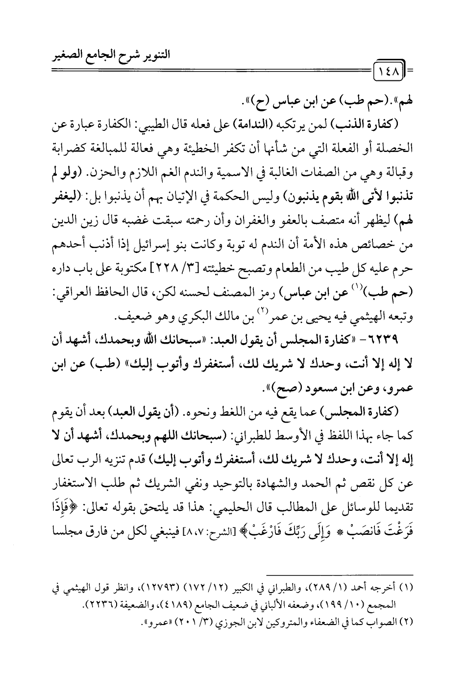 6239 - "كفارة المجلس أن يقول العبد: "سبحانك الله وبحمدك، أشهد أن لا إله إلا أنت، وحدك لا شريك لك، أستغفرك وأتوب إليك" (طب) عن ابن عمرو، وعن ابن مسعود (صح) ".